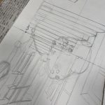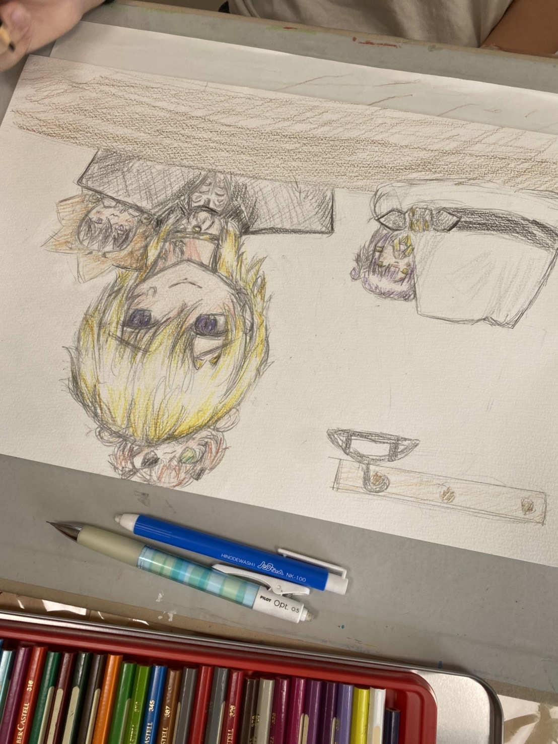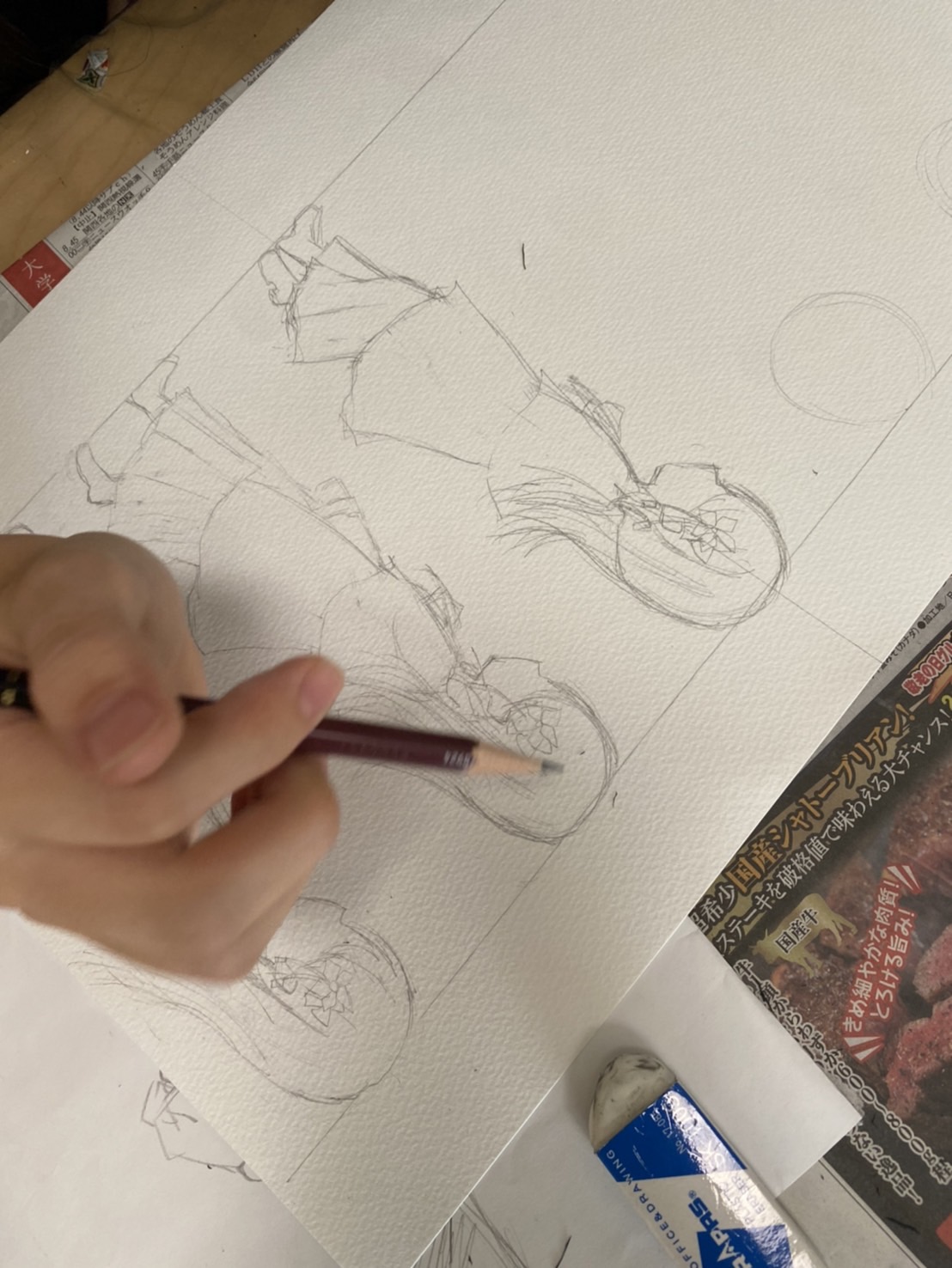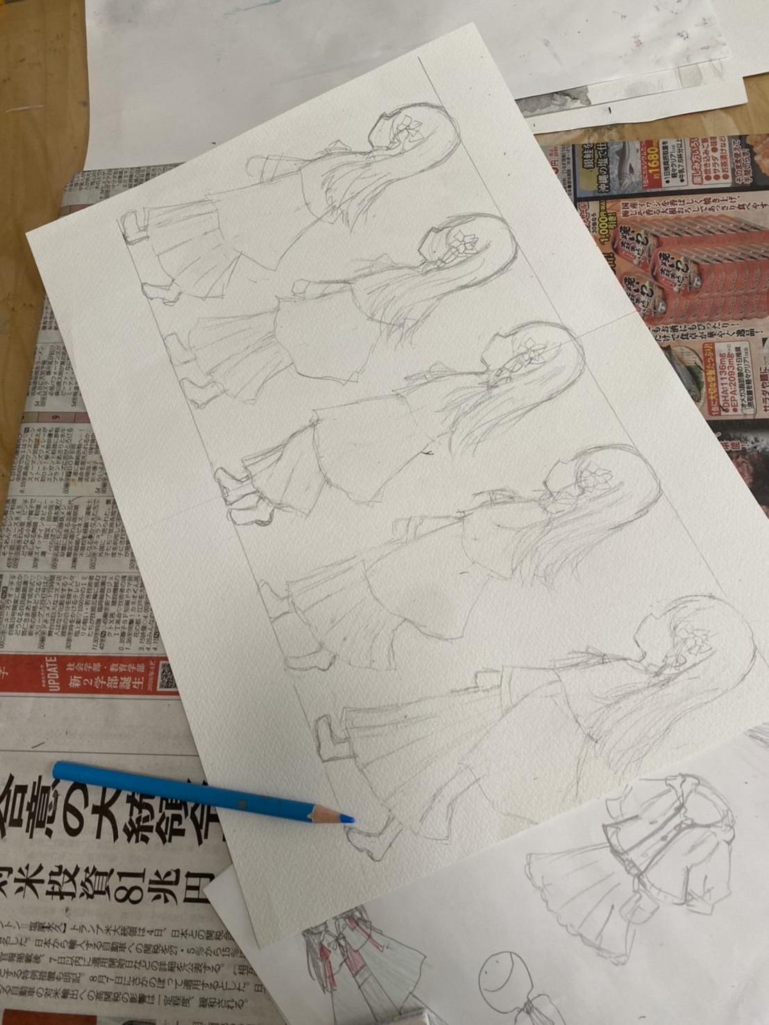 メインの人物の肩幅がもう少し広い感じがすると、描きなおしていました。また顔が少し傾いているので、より肩と顔のバランスもイメージにつながってきますね。