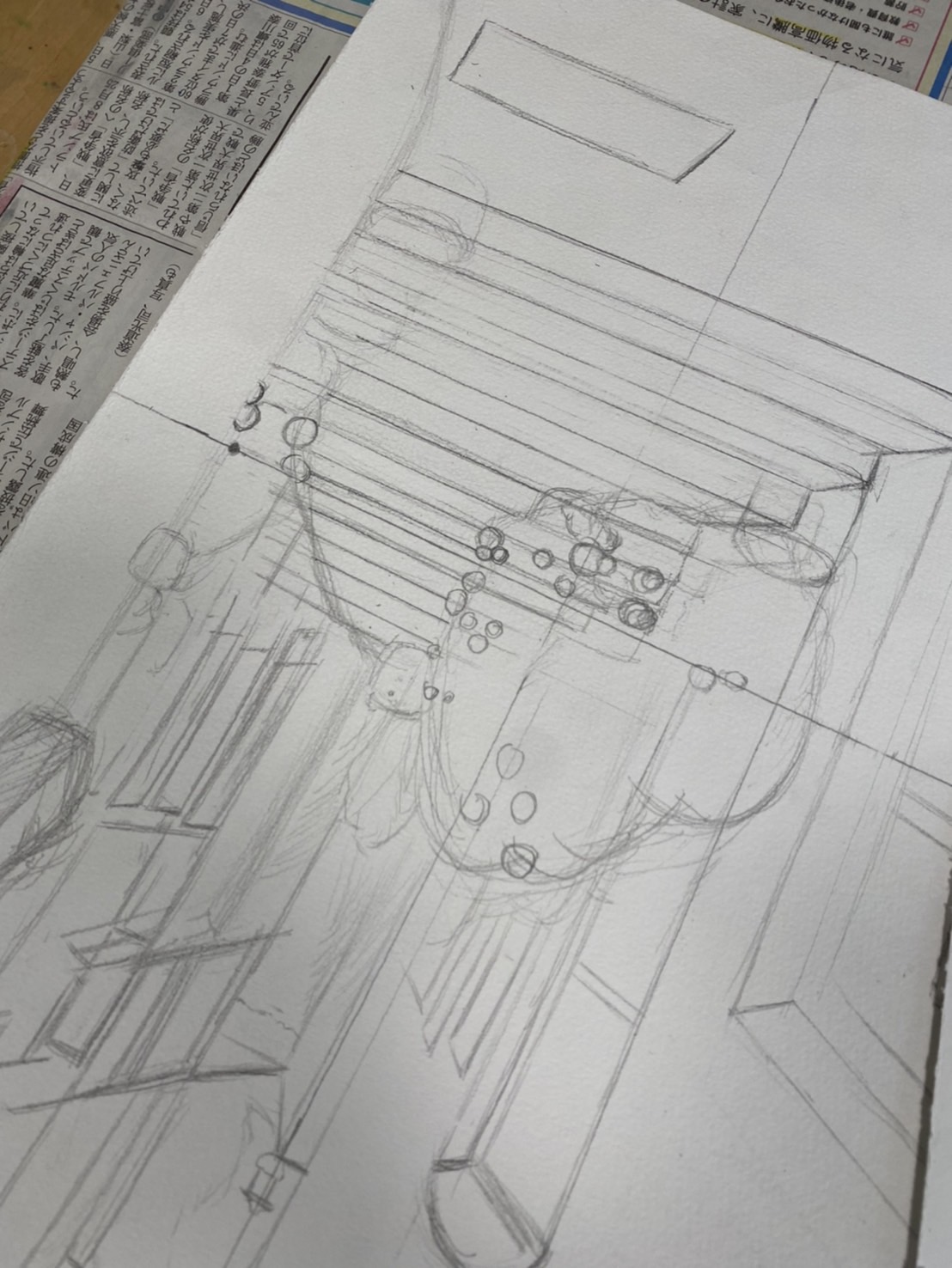 お洒落なお店の風景画では、ペンで清書の前に、階段の線の整理を行いました。