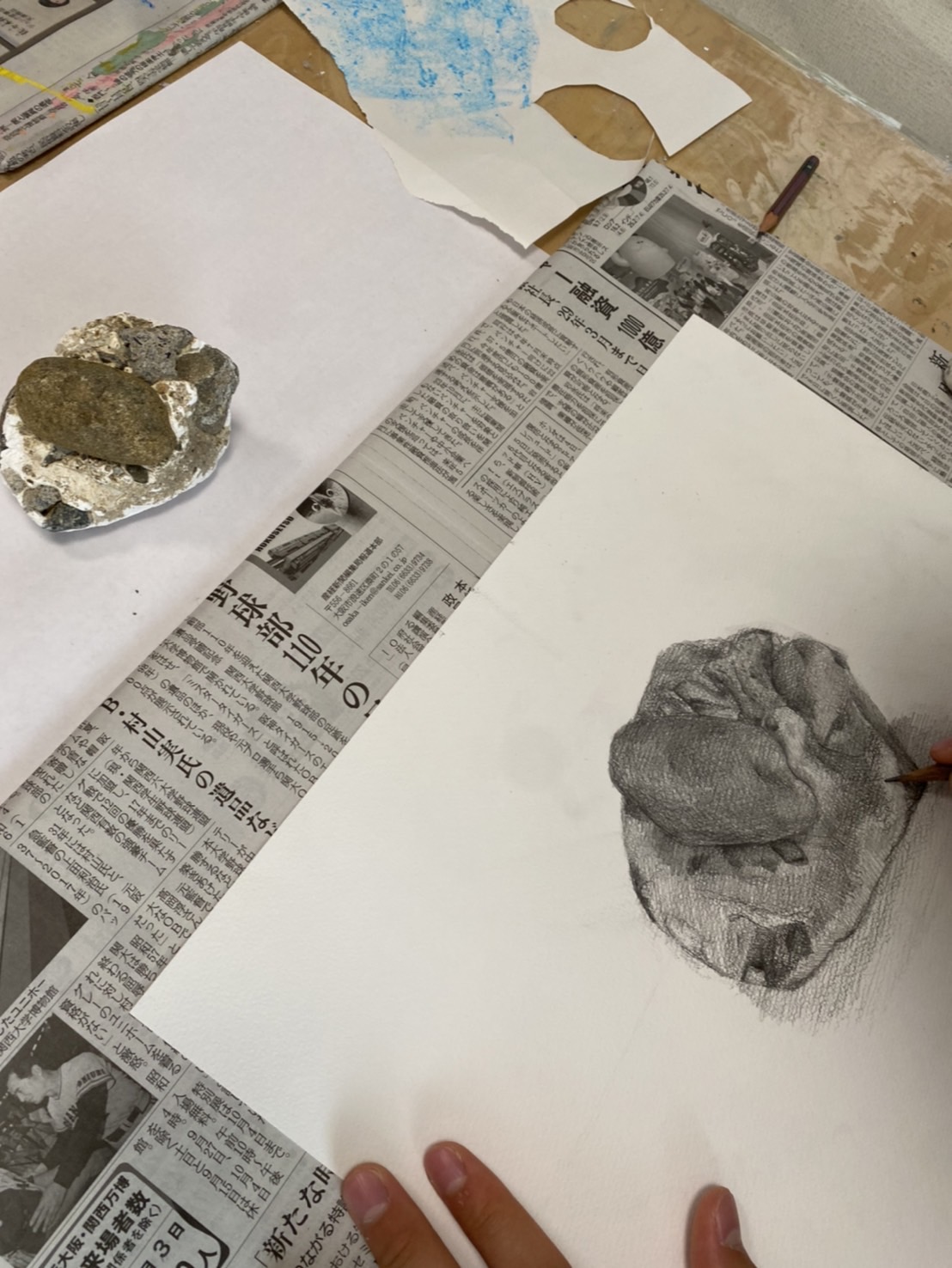 そして、石のデッサンは、色が少し似通ってきたので、ねりゴムなどを使って、明るい面を作ることも意識して取り組みました。