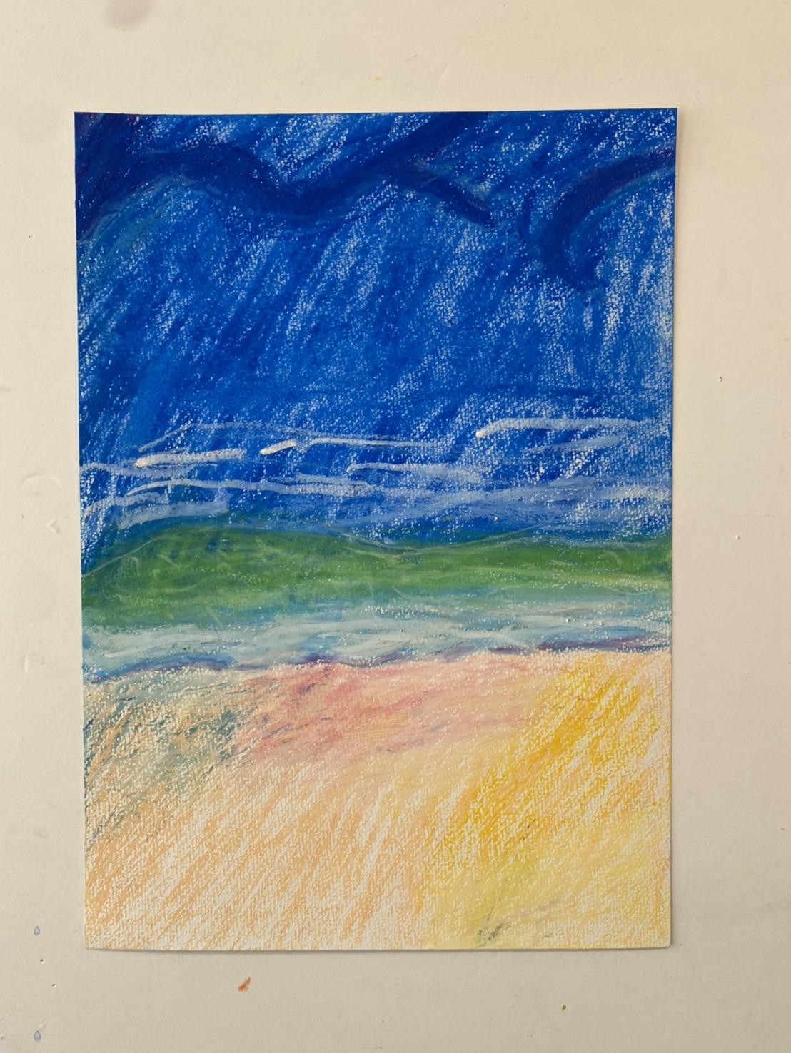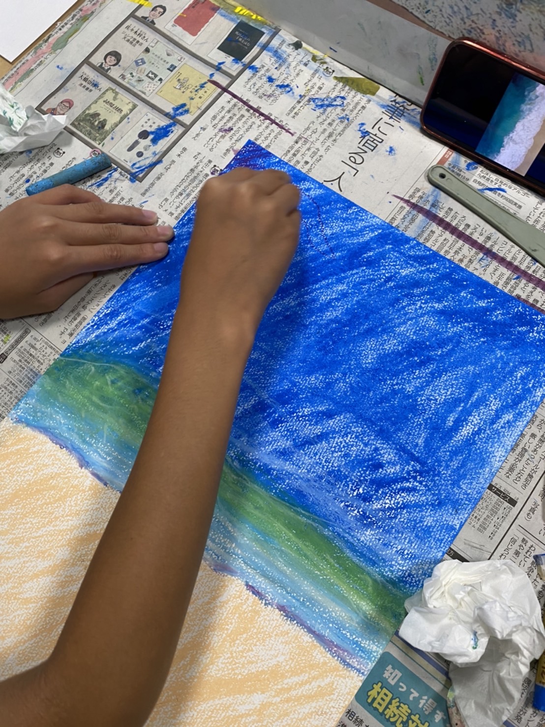 クレパスの色をしっかりのせて発色よく色面を作っています。そして、海の色ですが、深いところから浅いところの色の変化を色を重ねてこすったり、引っかいたりしてなじませて表現していました。砂浜も、光の変化を取り入れて、色を重ねて、軽やかさが出ました。