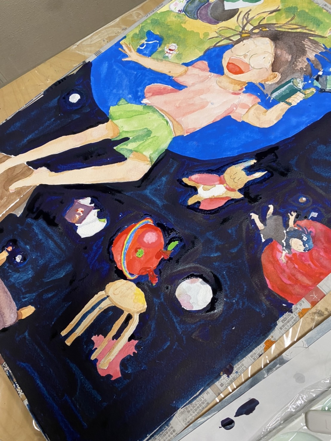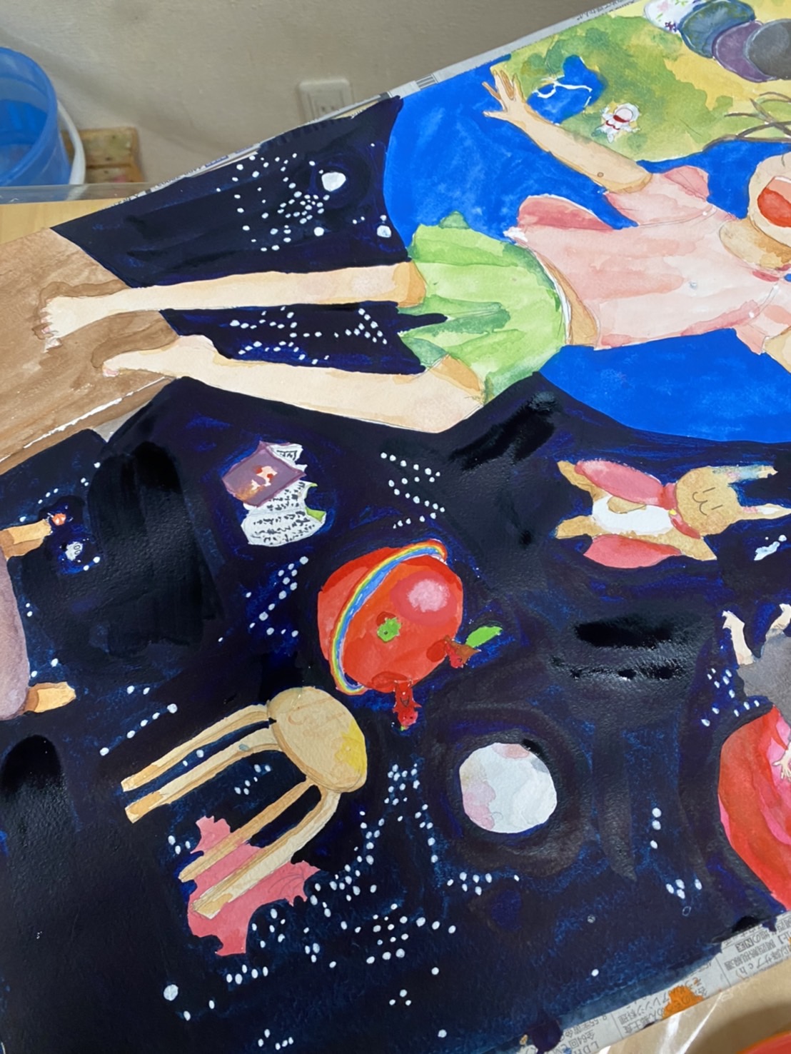 背景は宇宙空間の暗い色を作って、モチーフの形がきれいに見えるように形の際もしっかり塗りました。