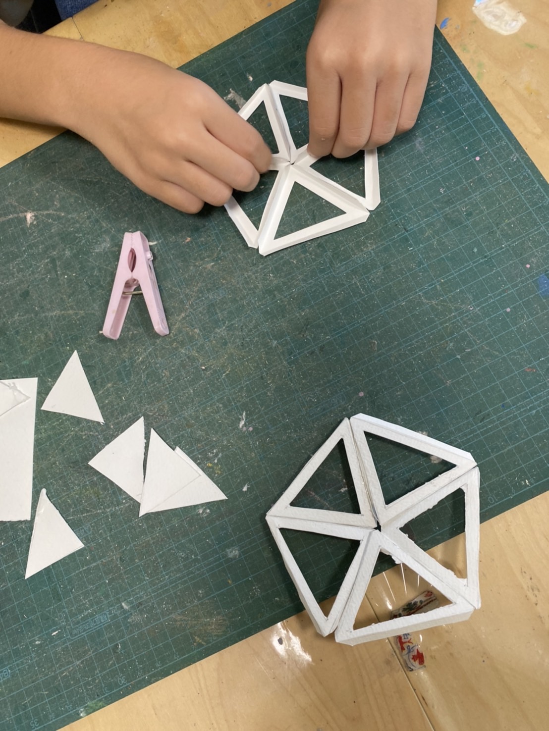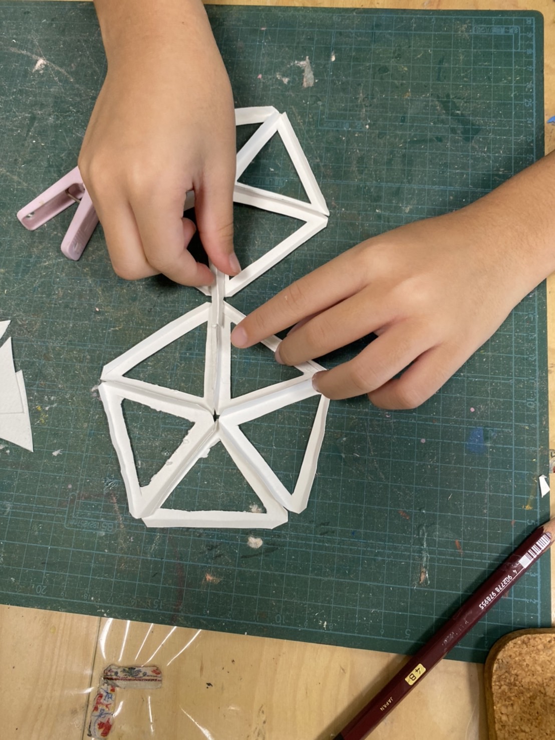 紙を使った工作がしたいとのことで、ジオデシックドームを作り始めました。カッターを気を付けて使いましょう。