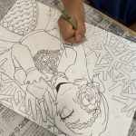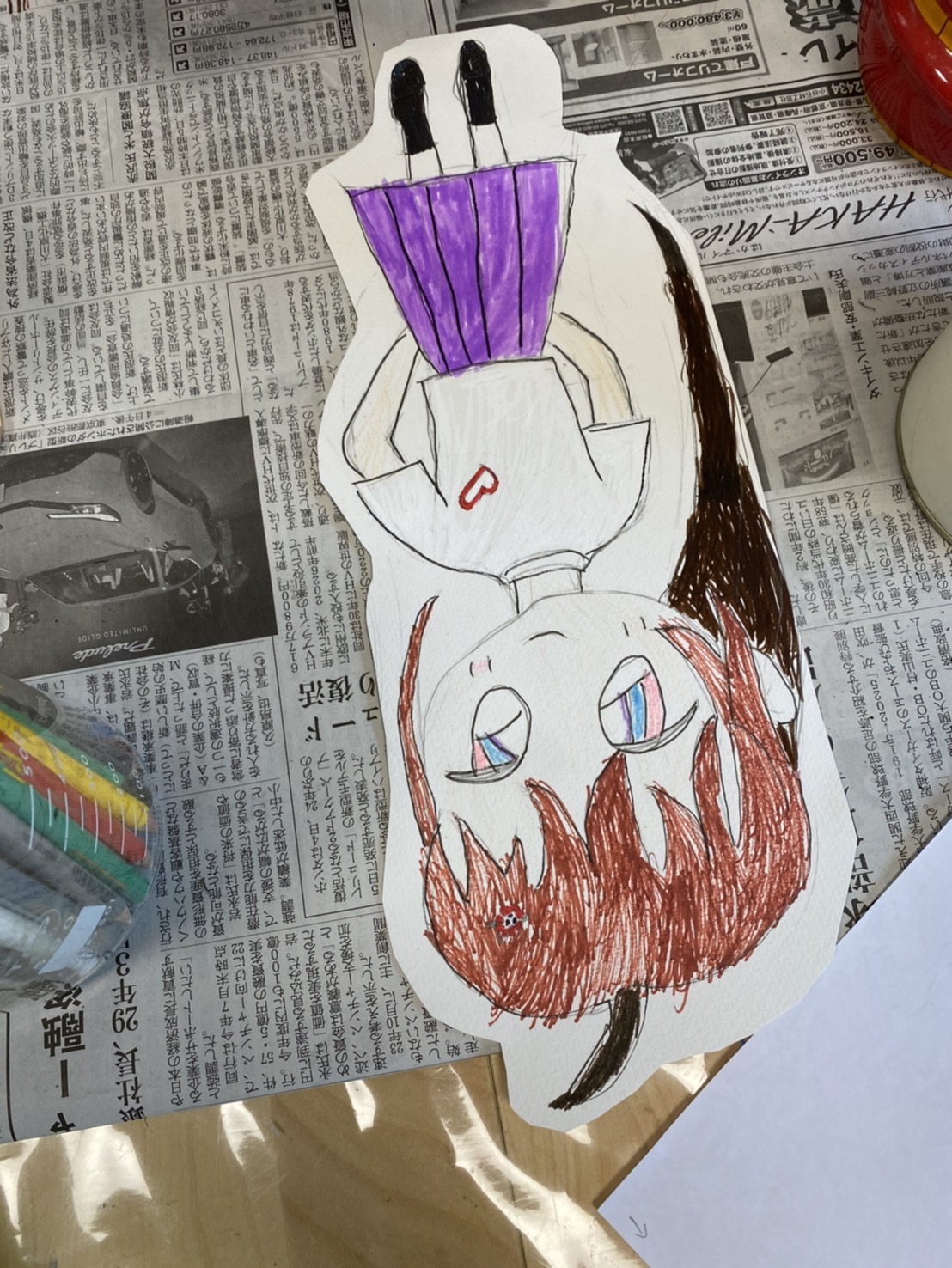 そして、自由絵画は、人物の色を塗っていきました。前回描いた人物です。ミャクミャクのヘアピンなど小物アイテムもかわいいですね!