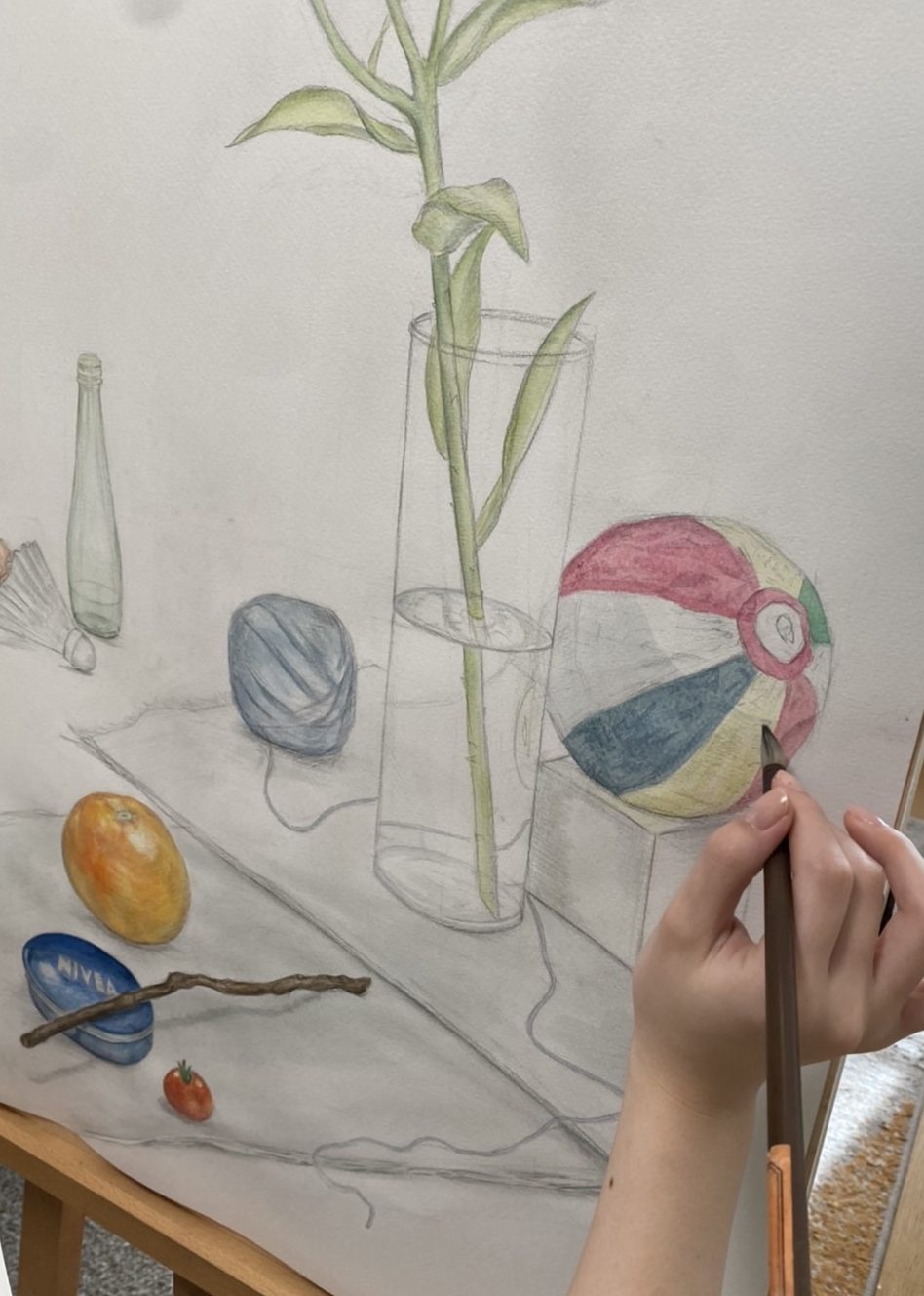 こんにちは、2025年9月28日 日曜日(朝)クラスでは、鉛筆に親しもう、静物の着彩デッサン、石のデッサンを行いました。