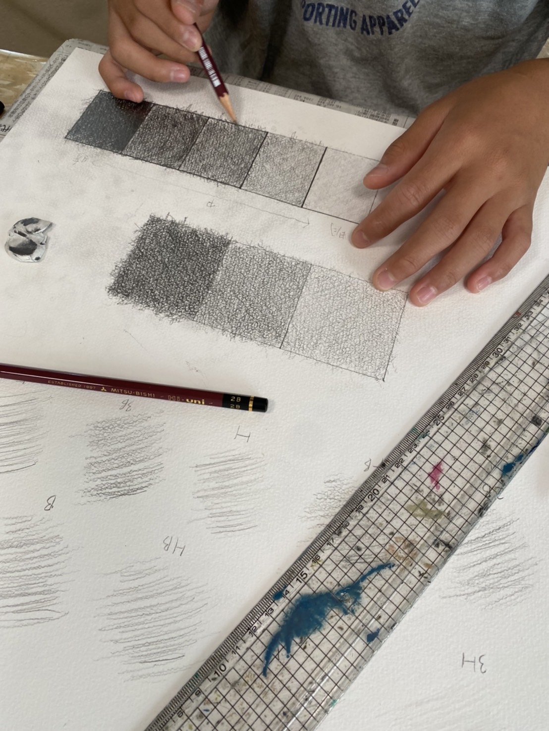 鉛筆に親しもうでは、鉛筆の色や固さを確認したり、階調を作ってみたり、鉛筆の表現や色の幅を見ていきました。
