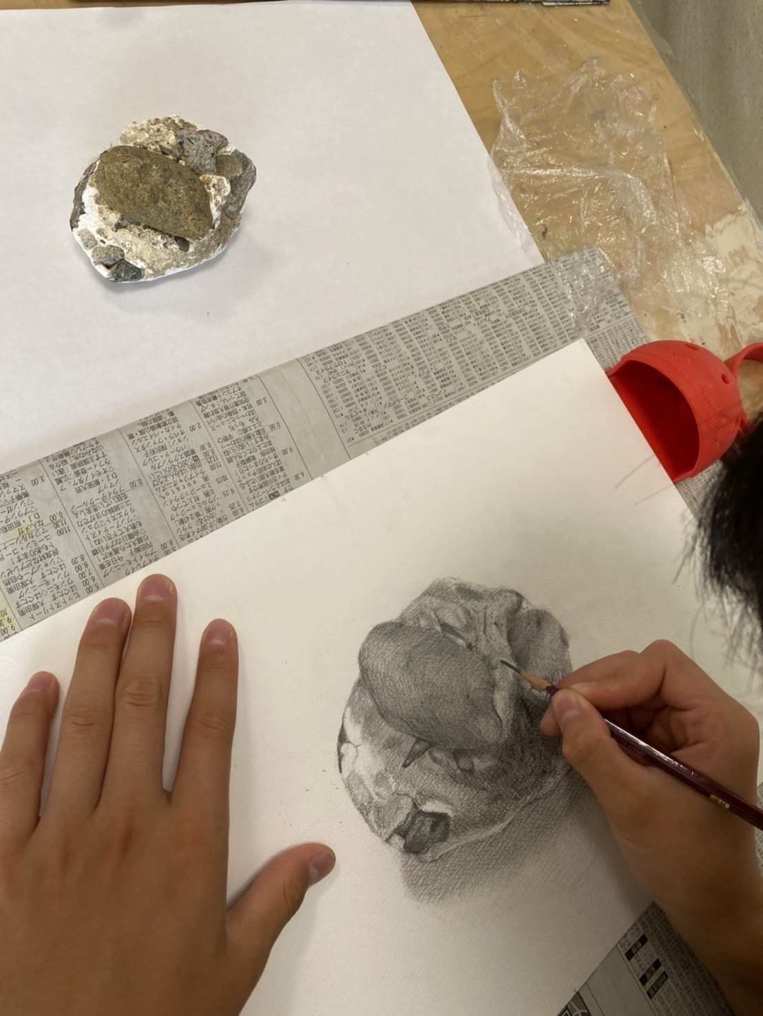 そして、石のデッサンは、影を描いて状況の整理、また、石の前面の情報を増やすなどして進めています。
