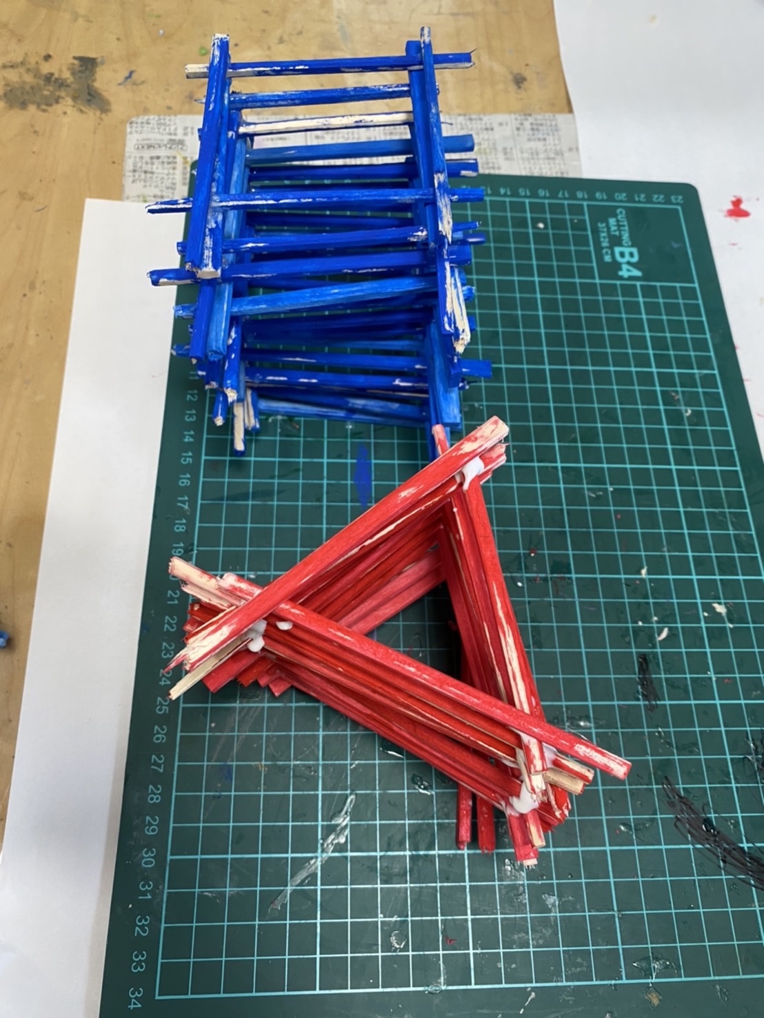 そして、三角形の形に棒を組んでいきますが、力を入れて置くと、組まれた棒が崩れてしまいますので、力を抜いて、そっと置く感じで進めてます。
