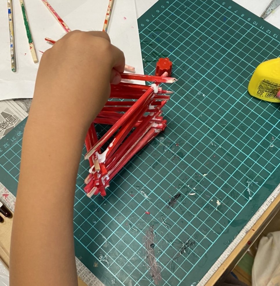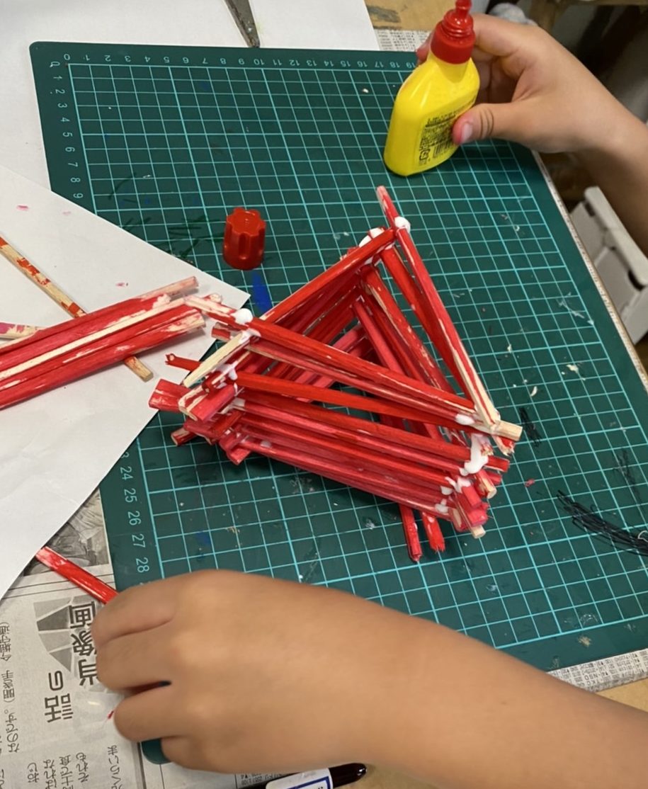 少し長めの棒を切って先がとんがったらヤスリをかけたり、赤色で全体によく塗ったり、準備をがんばって取り組んでます。