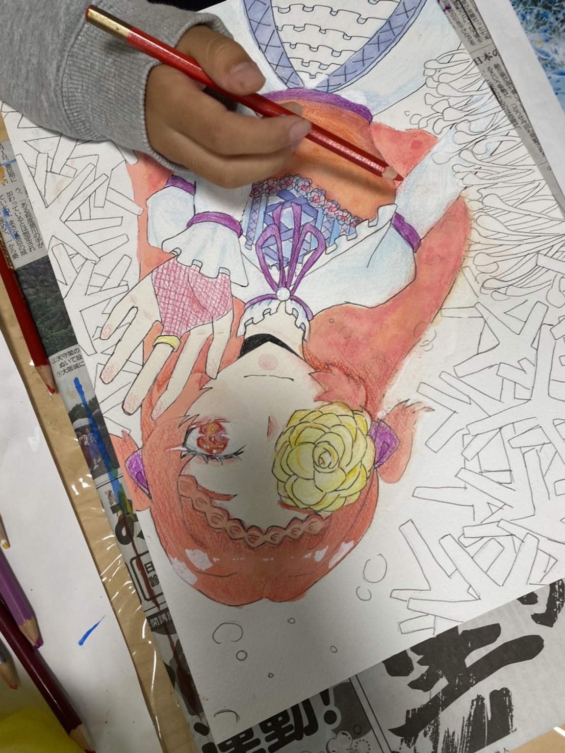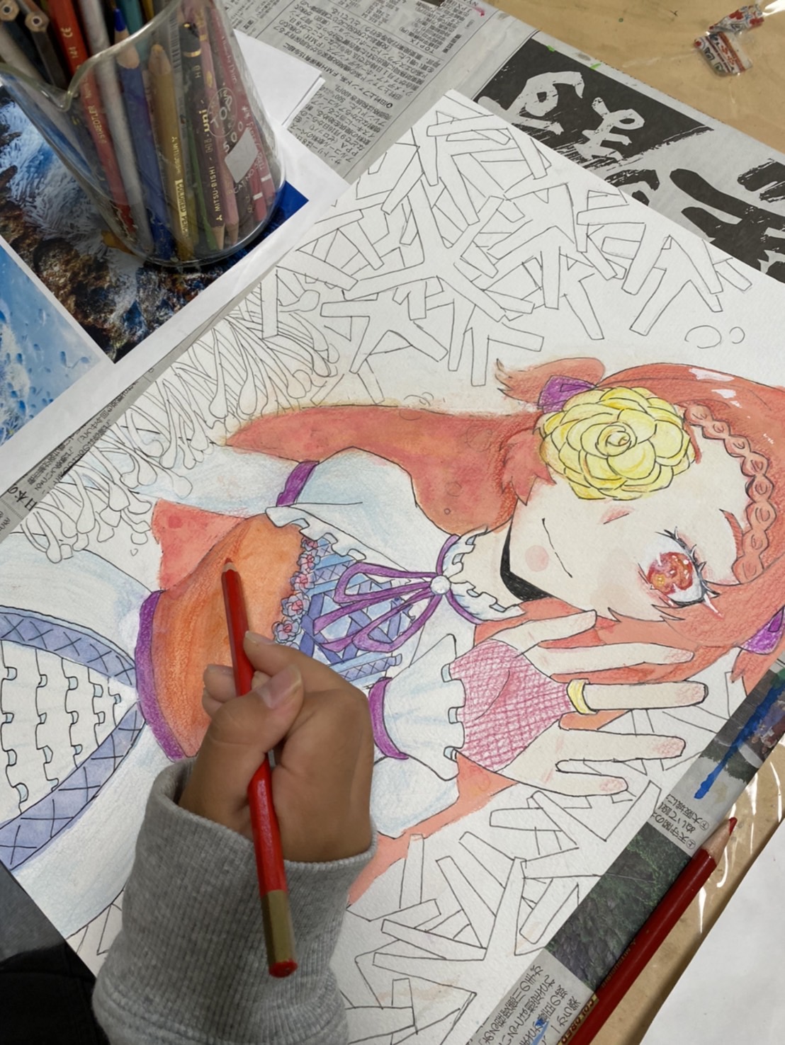 微妙な陰影や、細かい部分の描き込みを色鉛筆を使って彩り豊かに進めています。
