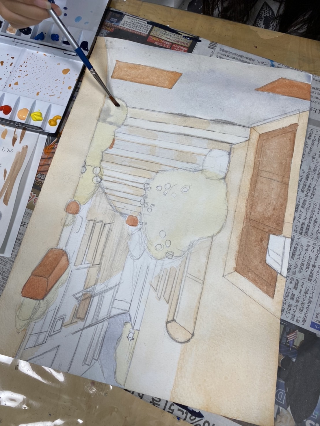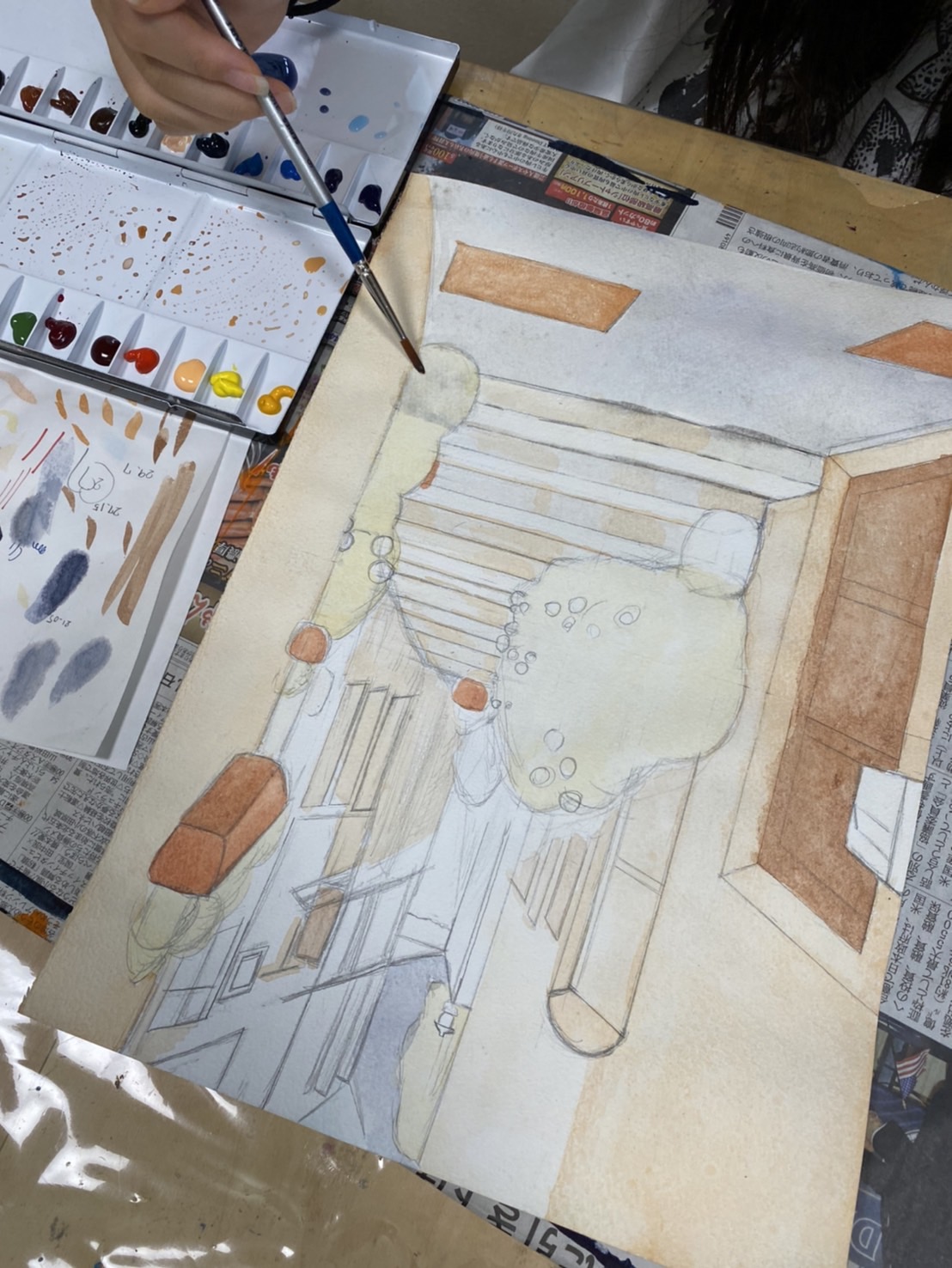 手前の壁の固有色を置いたり、植木の下塗りをしたり、全体に色をのせて、進めていていいですね。