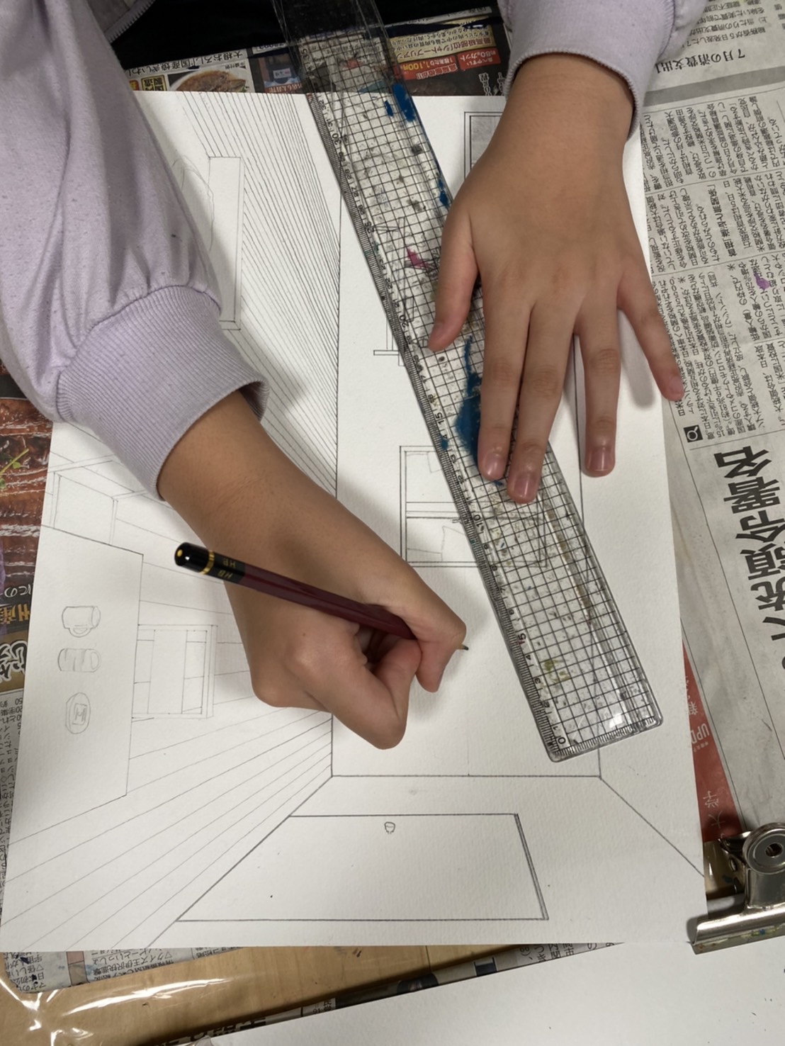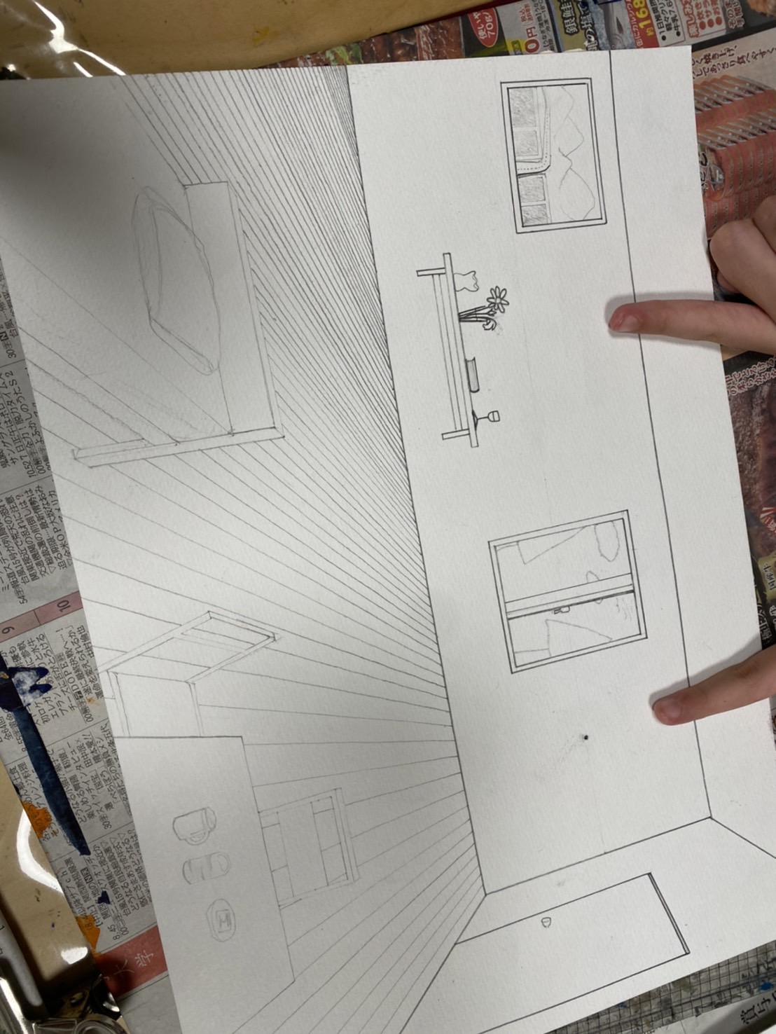 モチーフを増やしたり、カーペットを置いたりしてもいいと思いますが、フローリングの模様を描いて、奥行き感を出していってました。