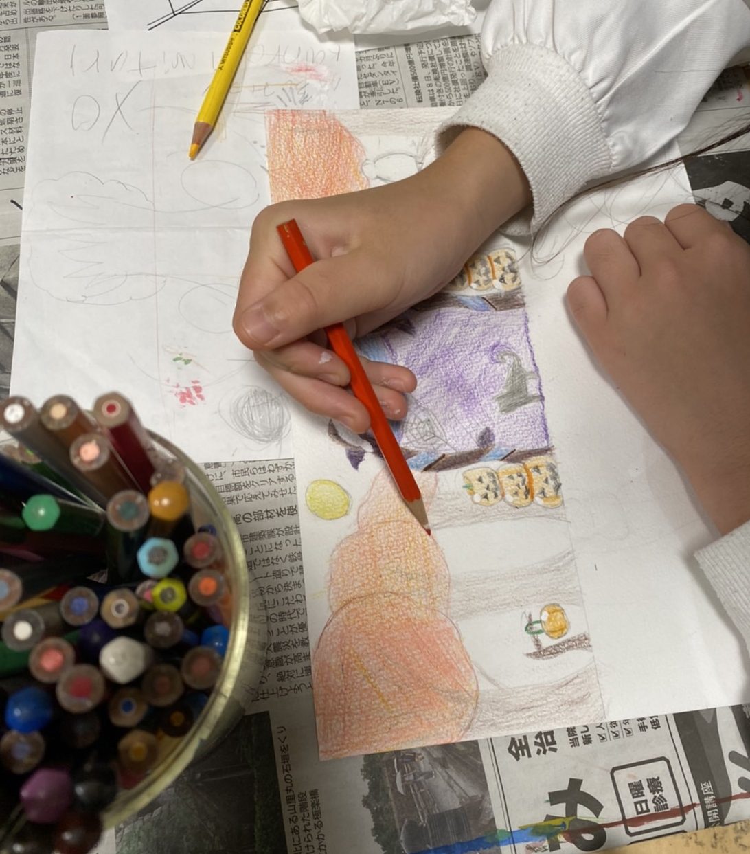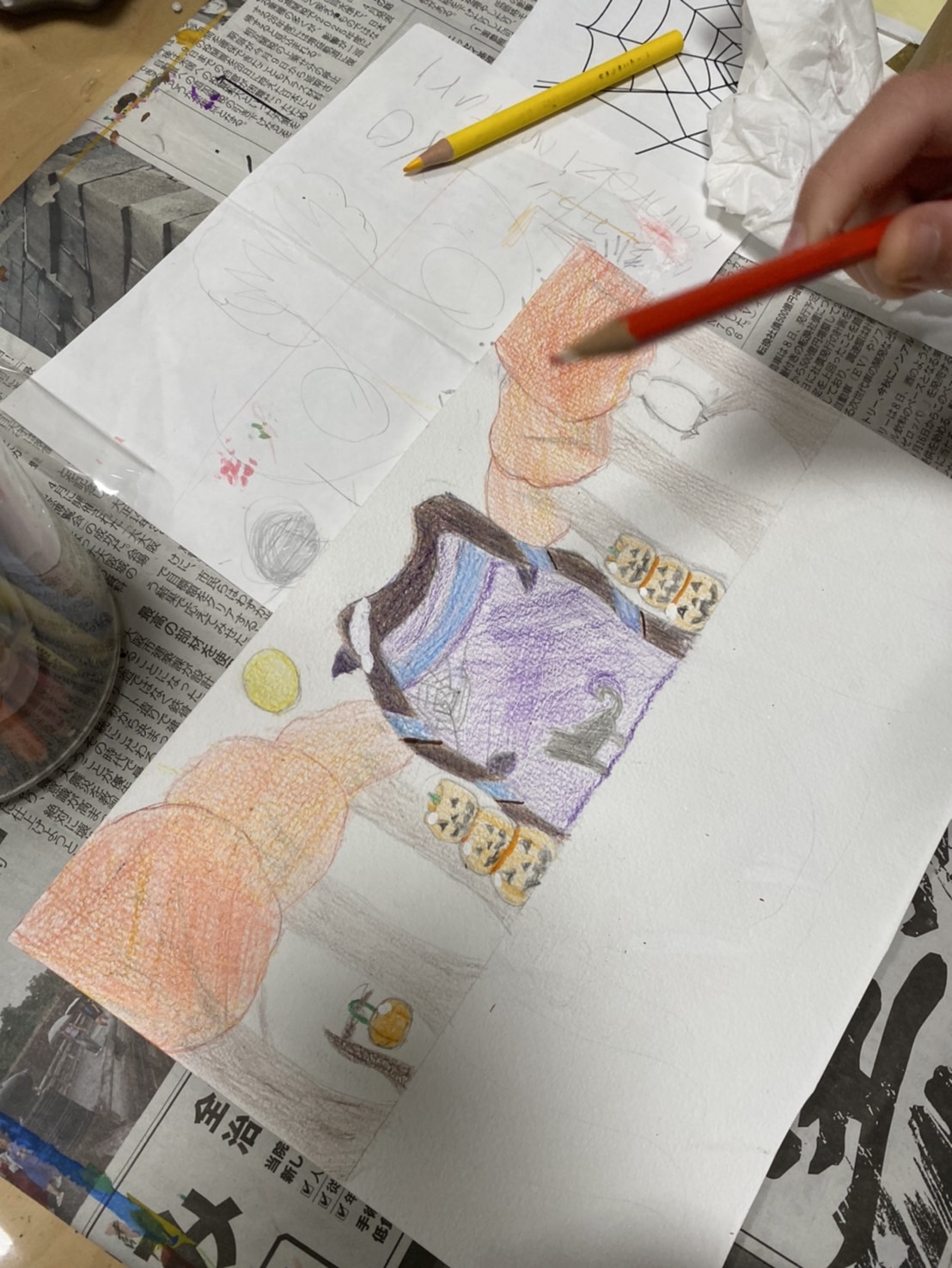 そして、ハロウィンの色鉛筆画は、水面の映り込みをテーマに描きたいとのことですので、地上の風景の描写は濃い目にしっかり形と色を描くと、水面に映るイメージとの対比が出来て伝わりやすいので、がんばって色鉛筆を重ねて描いていました。