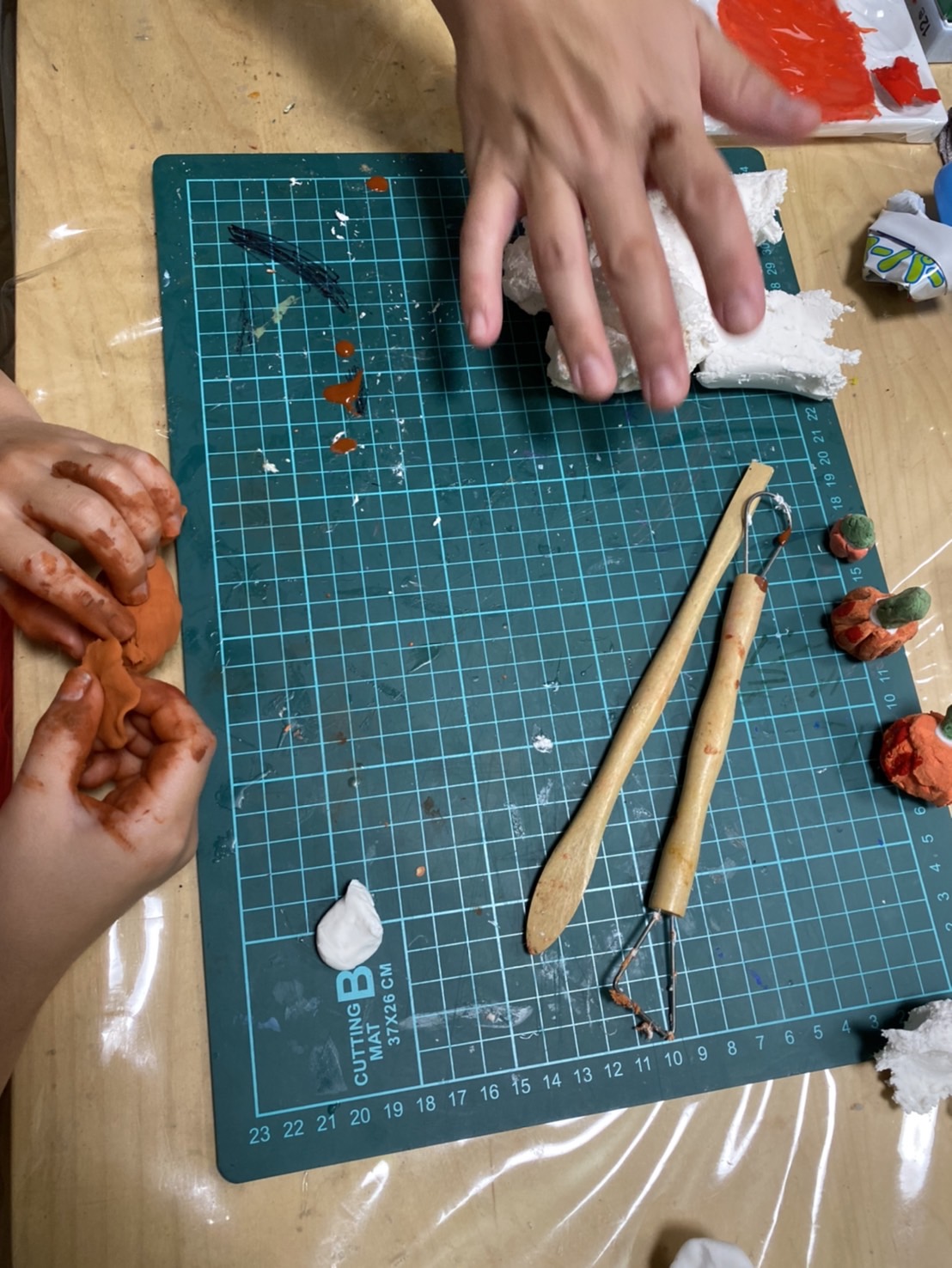 ねんどにかぼちゃの色をよく練り込んで、形を丸めてから、粘土ベラで、かぼちゃの模様を付けました。道具も使って和菓子職人のようでしたね!