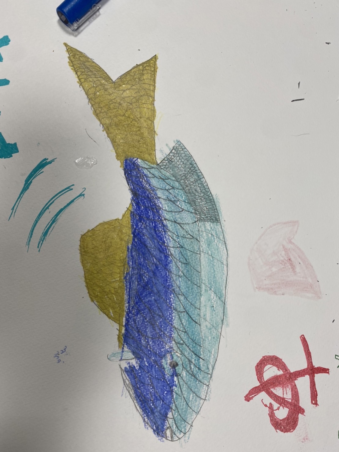 また、鱗も大変そうでしたが、しっかり描いて鱗のリズムもいいですね!色鉛筆とペンでかねて描き、きれいな色の組み合わせをよく表現しましたね!