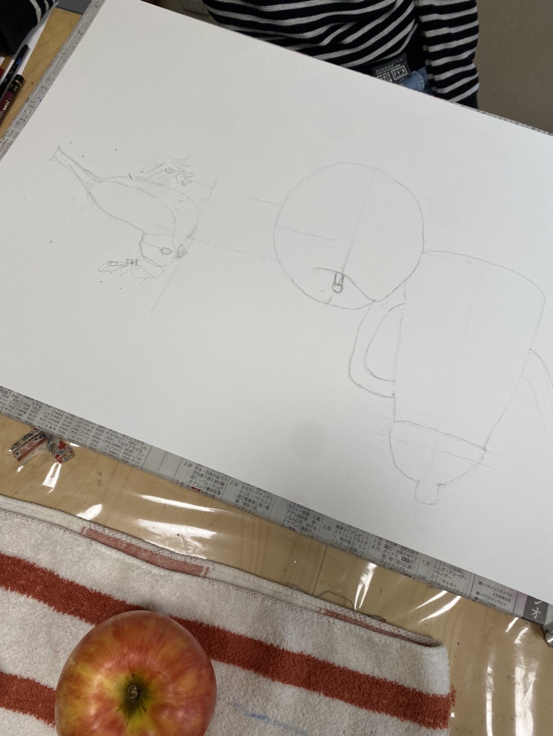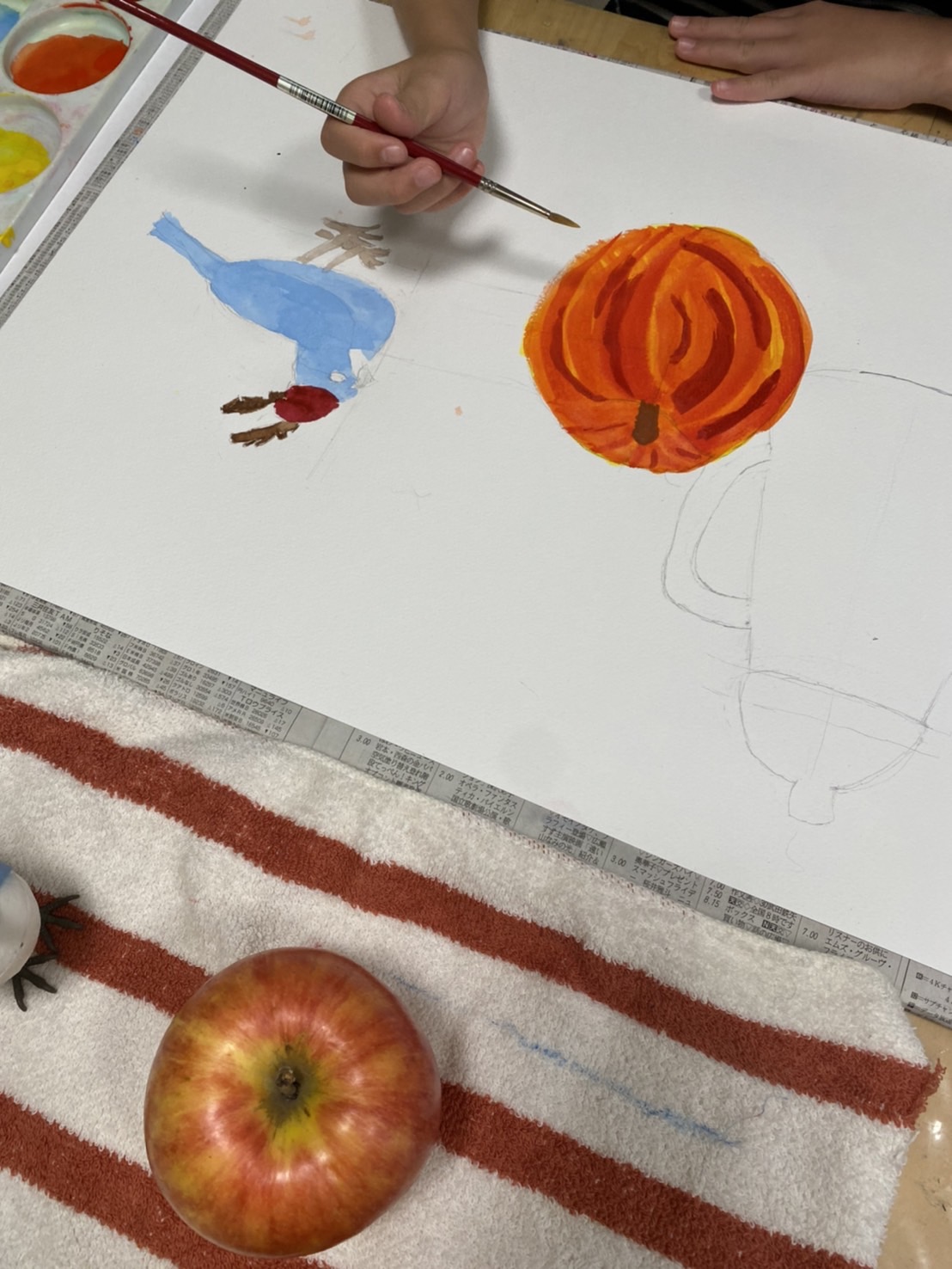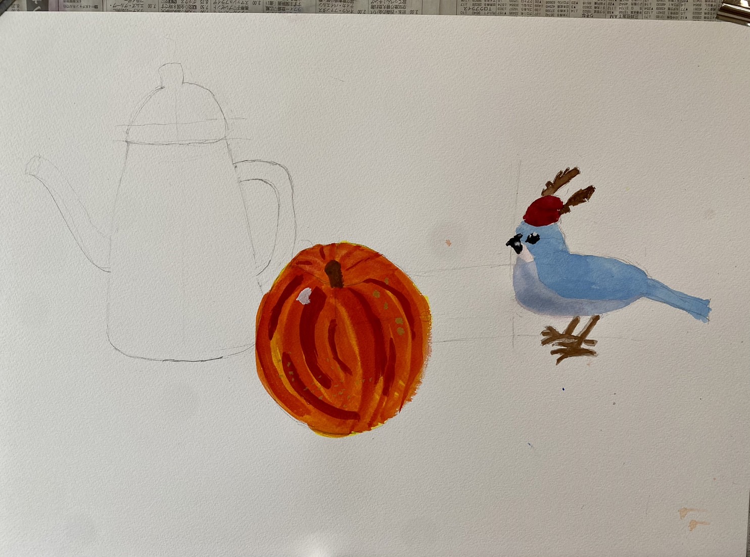 モチーフをよく見て、形を描き、着彩しました。形は、ものの中心軸に注意して描くことによく取り組んでいました。ものとものとの空間も意識して描いています。