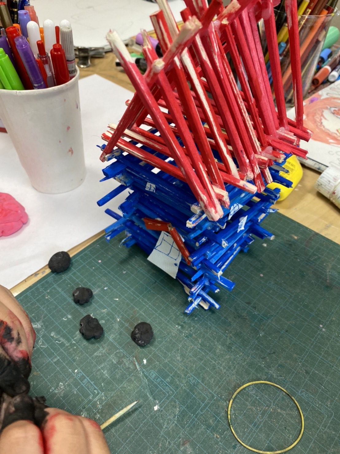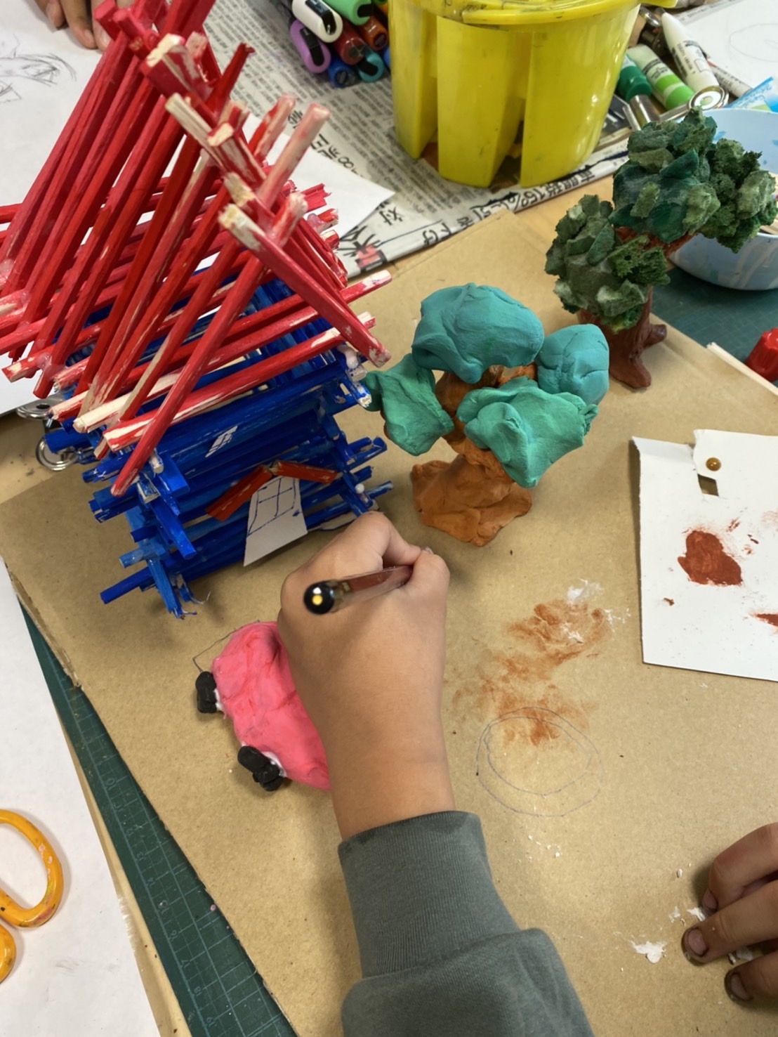 そして、立体工作は、前回作った屋根と住居部分を組み合わせて、家の形が出来ました!窓やドアを付けたり、またお庭部分にも取り掛かりました。