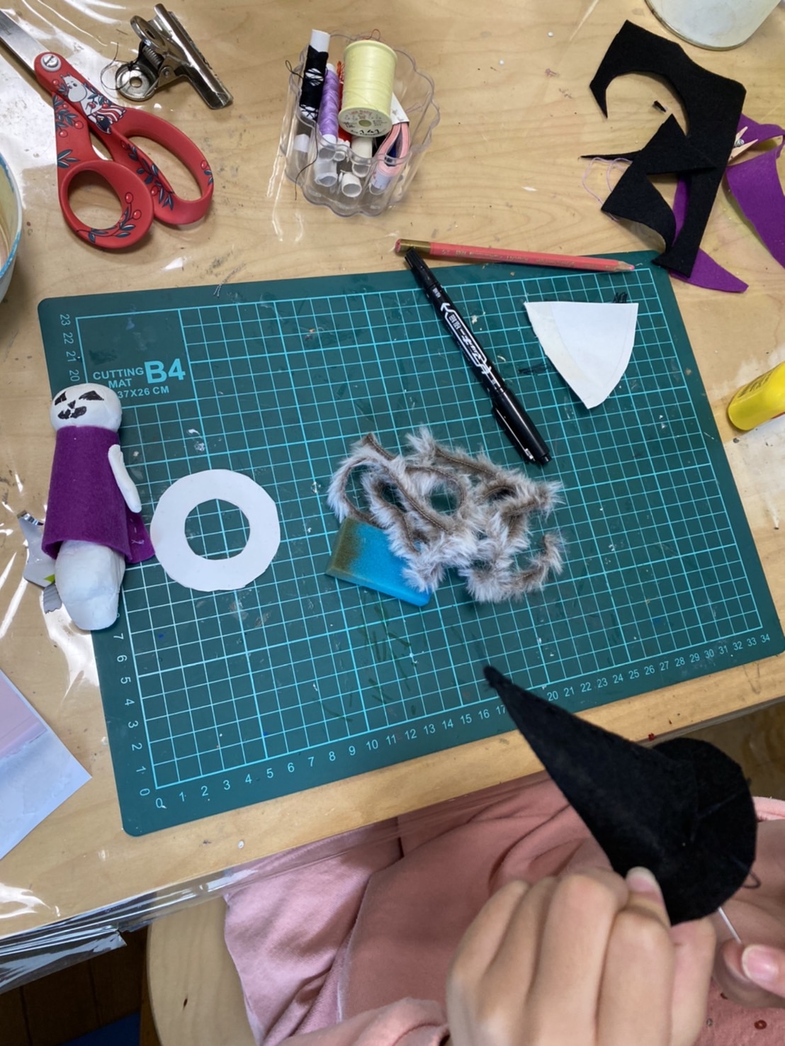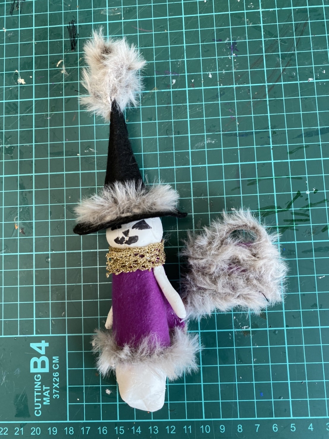 ハロウィンの飾りの工作は、ねんどと布を組み合わせて作りました。ねんどでお化けの本体を作り、お洋服や帽子はフェルトを縫って作っています。