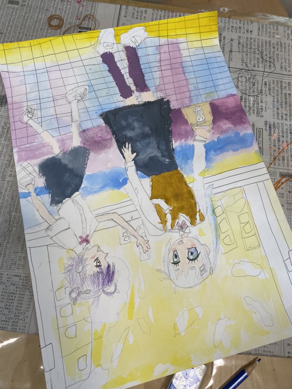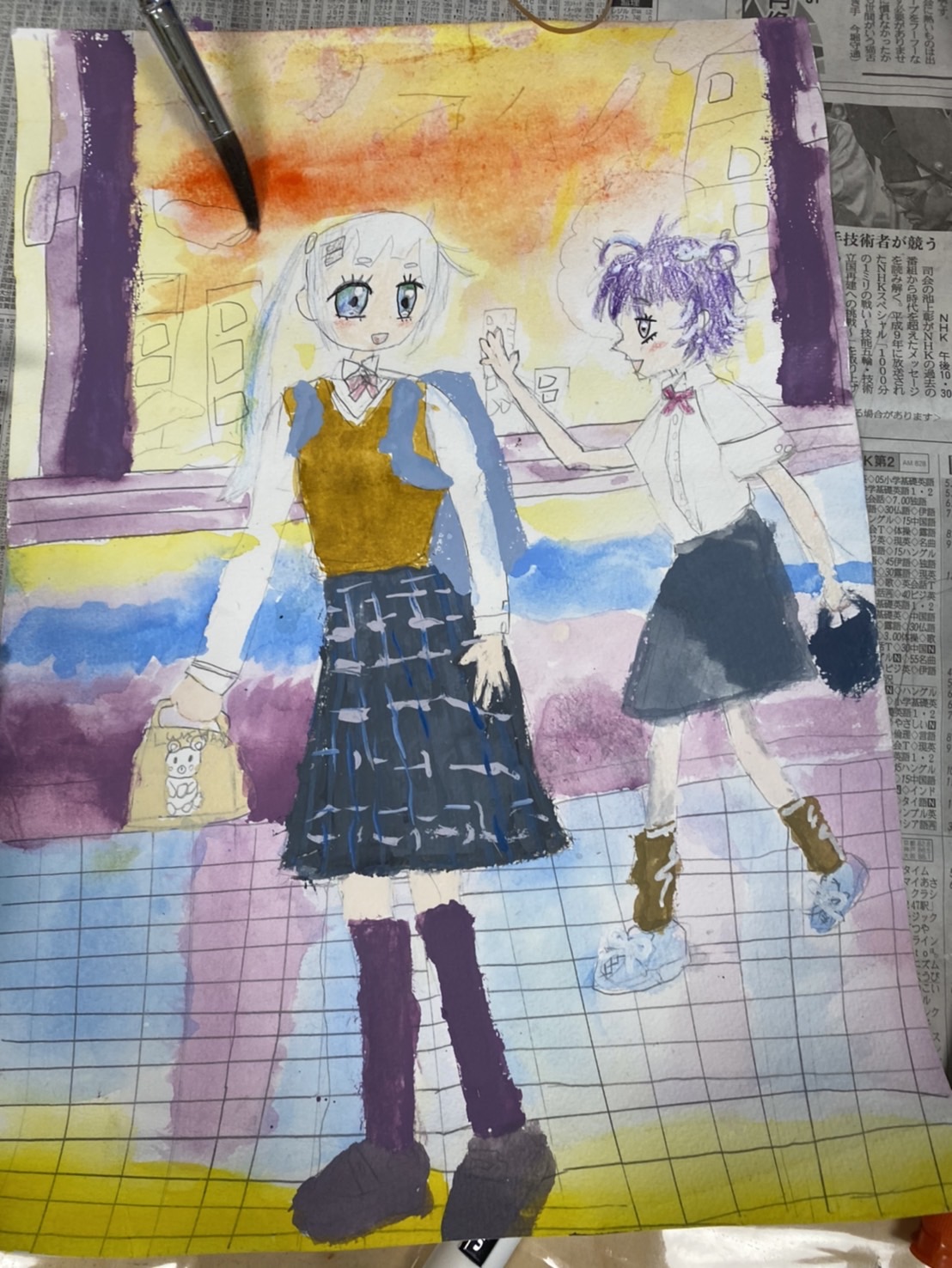そして、イラスト画は、人物のスカートなどを描いて、人物の着彩完成です!グレーの地にチェック柄と、筆の線を細く描くこともがんばりました。