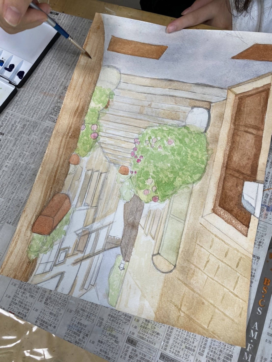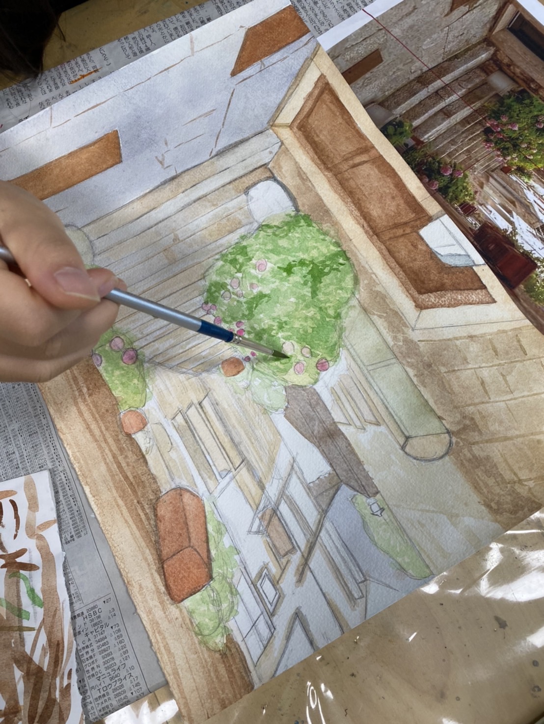 今回は、壁の模様や、植木の明暗を付けたりと、細かな部分も描いていきました。
