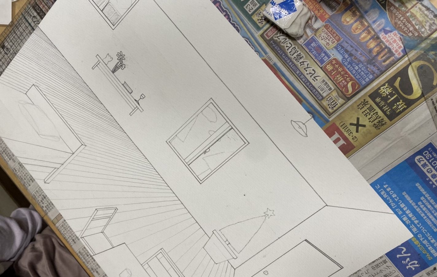 そして、一点透視図法で部屋を描こうでは、天井にライトを描いて、クリスマスツリーも描いて、空間が出来てきました。