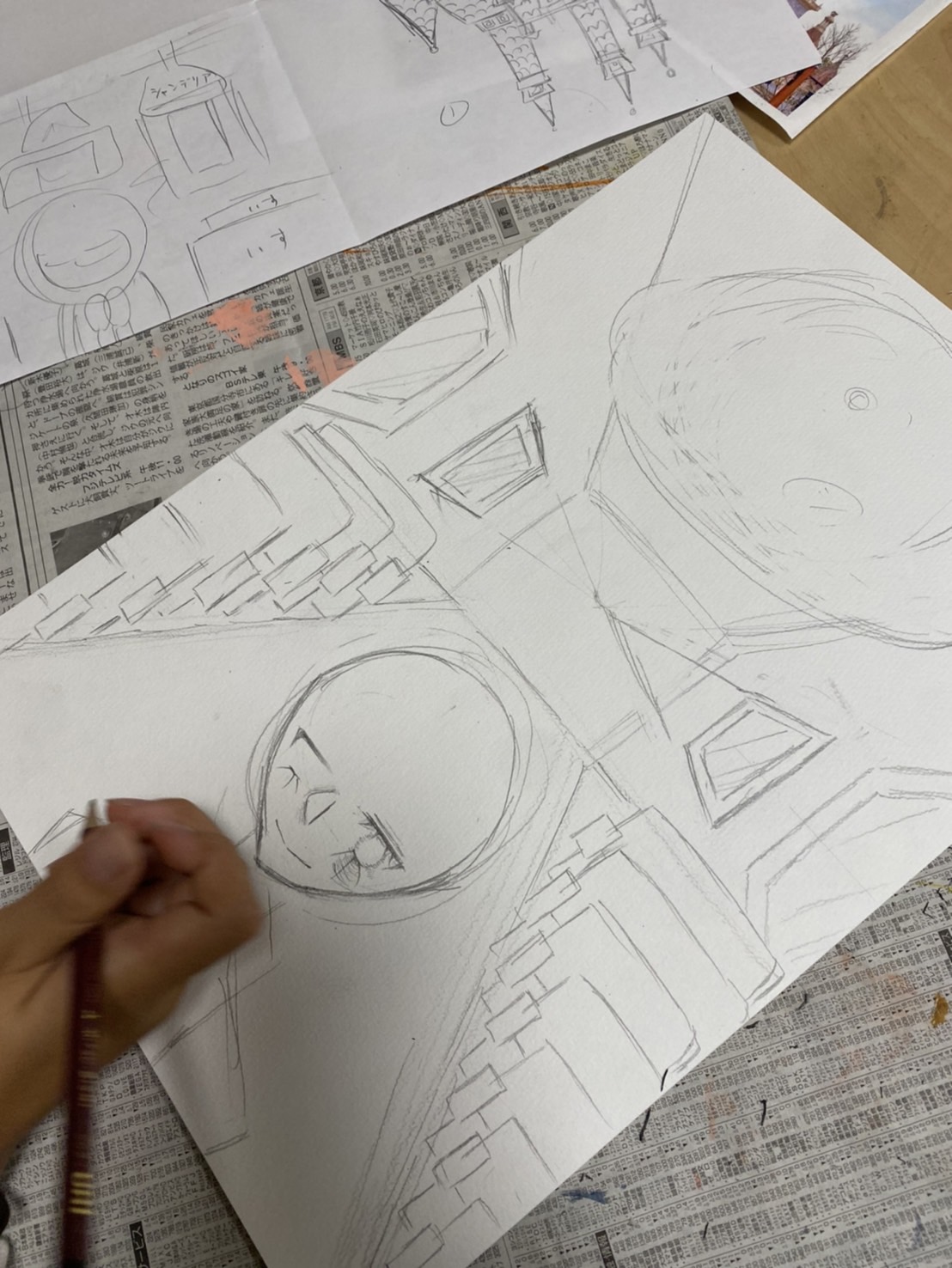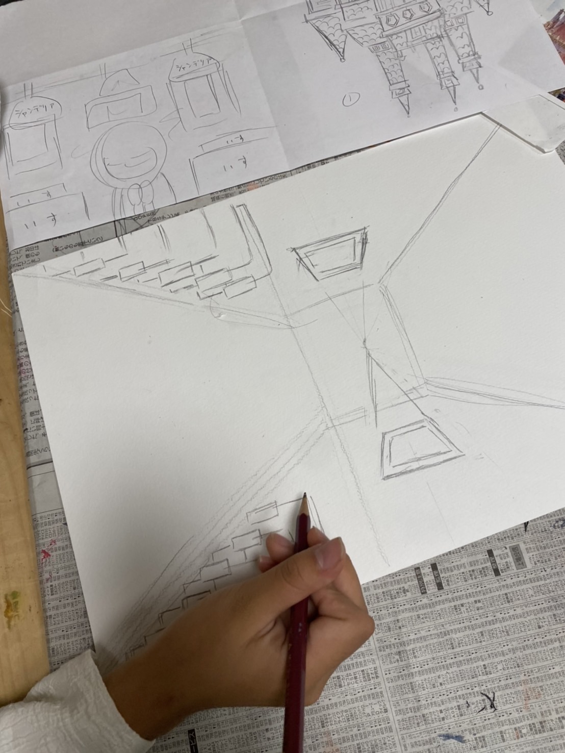 そしてイラスト画は、クリスマスをテーマに教会の空間を描いていくとのことです。一点透視図法も取り入れて空間造りをしています。