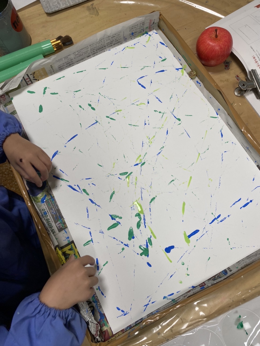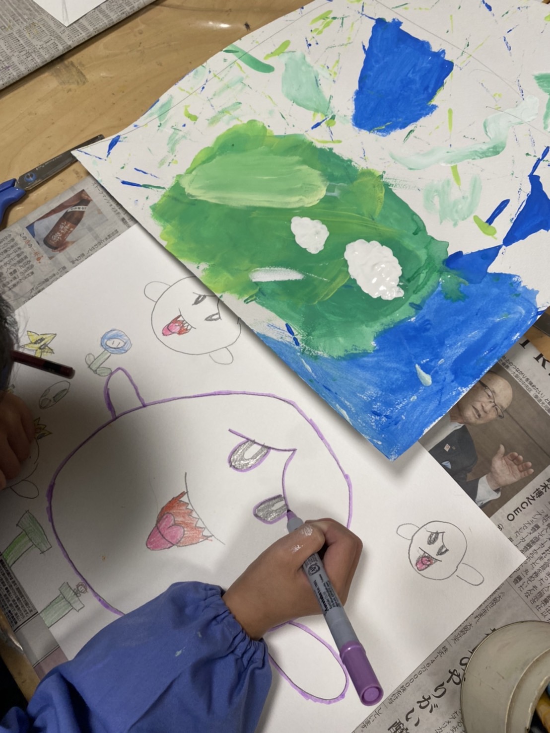 ビー玉絵画は、ビー玉を転がして線や点が出来たところに、面白い形を見つけて色を塗りました。