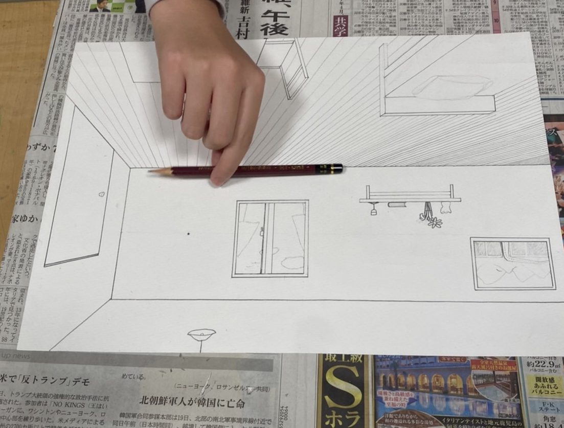 こんにちは、2025年11月5日 水曜日クラスでは、ビー玉絵画、一点透視図法で部屋を描こう、色鉛筆画、イラスト画を行いました。