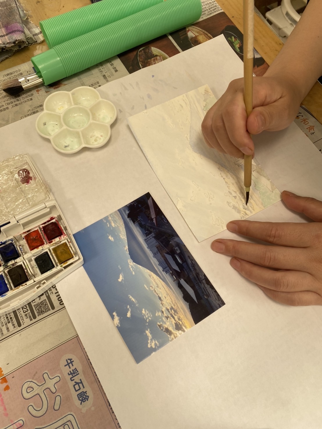 そして、月一成人クラスでは、富士山の風景画を描き始めました。色の鮮やかさが調和していてきれいな第一層が出来ています。