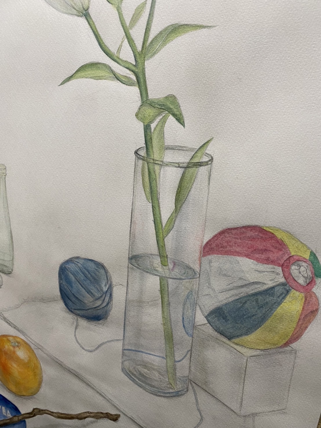静物着彩デッサンでは、ガラスの花瓶の口の部分をしっかり描いて、質感を出しています。