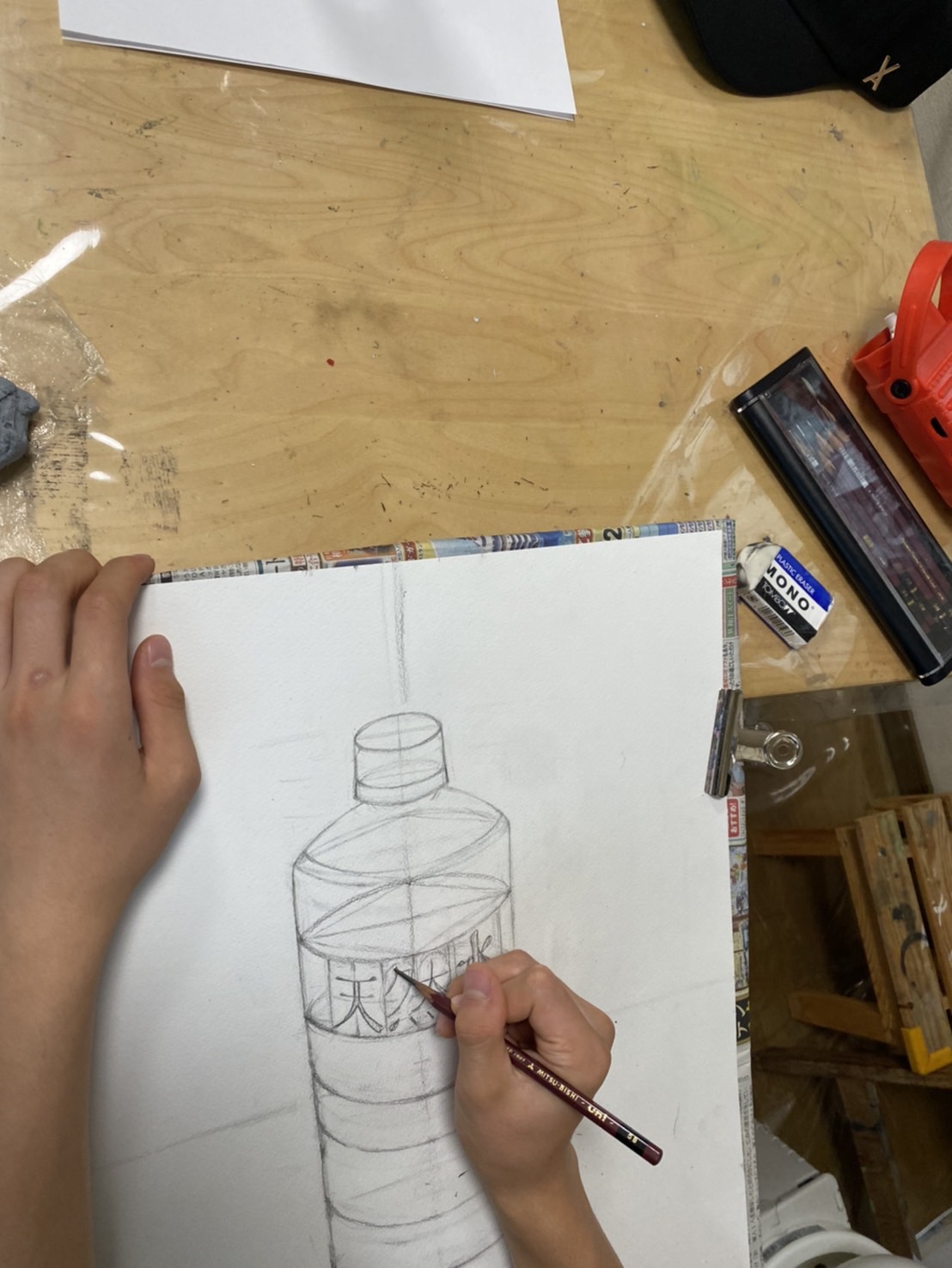 そして、ペットボトルのデッサンは、ラベルの描き込みです。ラベルの長さが長かったので、長さを調節して、レタリングの位置もまた確認して描きなおしです。邪魔くさいですが、ここは我慢です。レタリングは文字ですが、いつも描いている文字として見るのではなく、形として見て描きましょう。