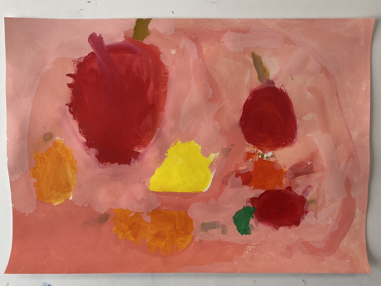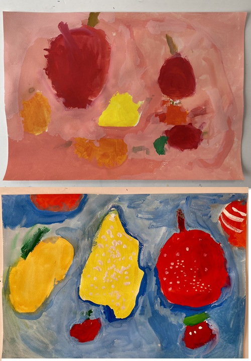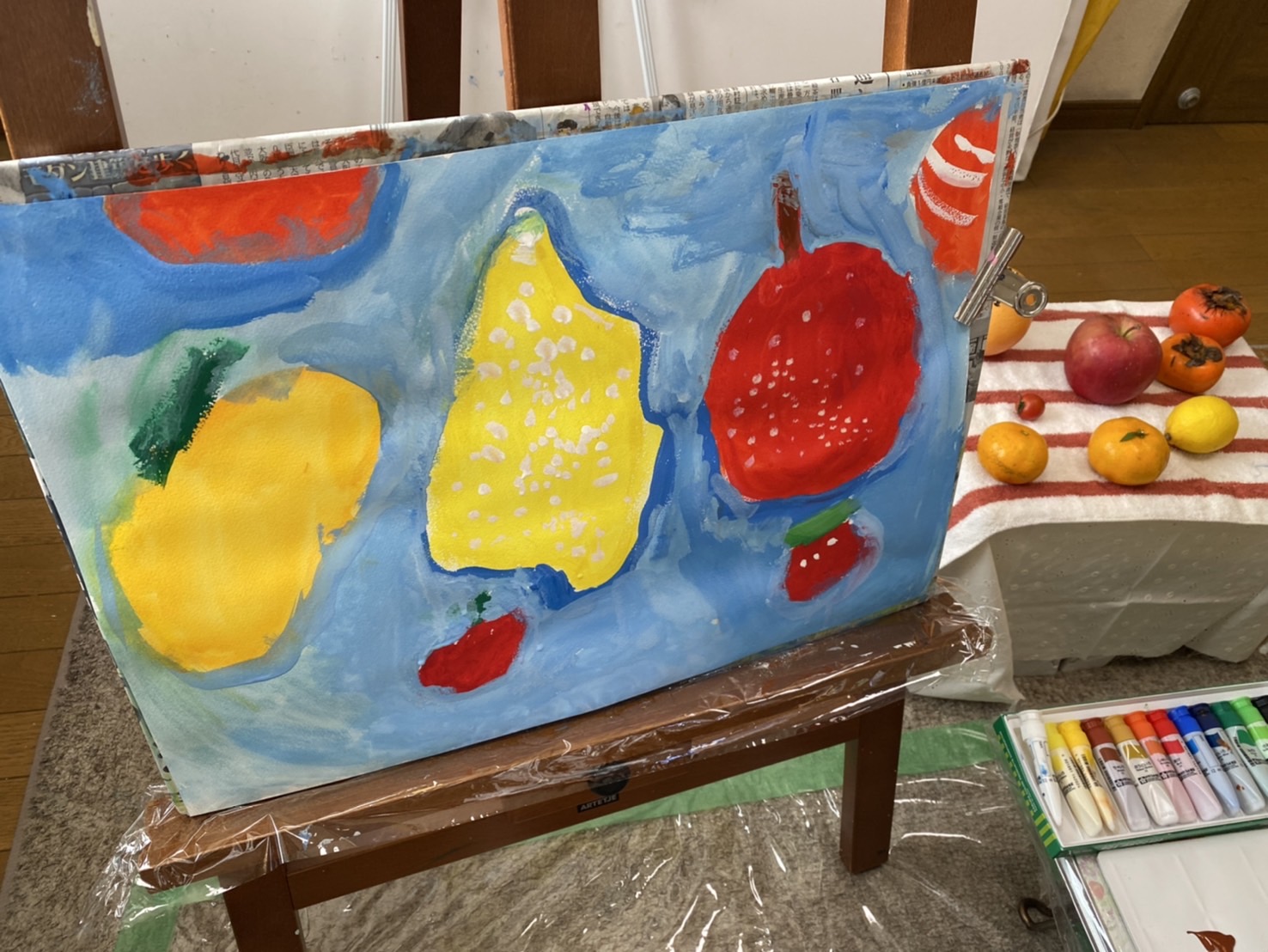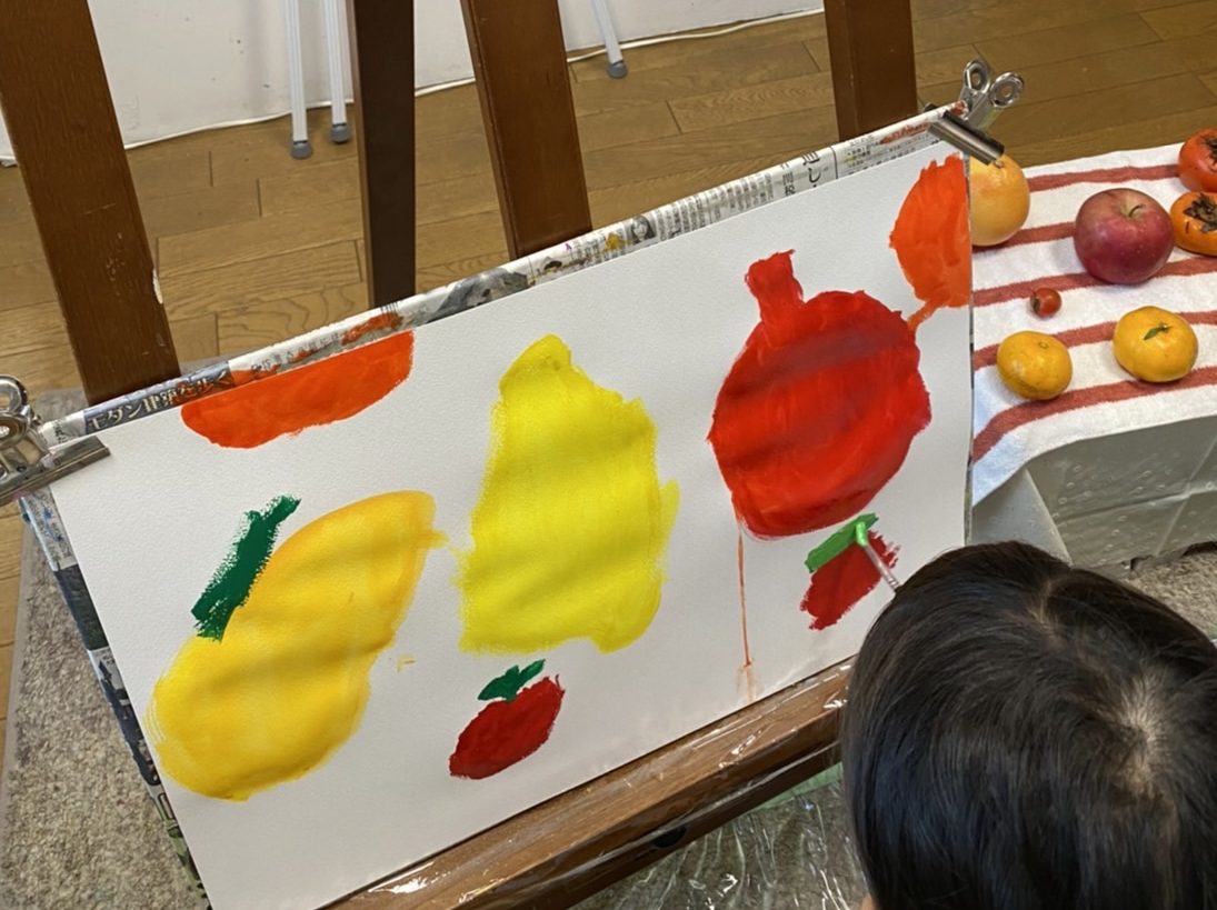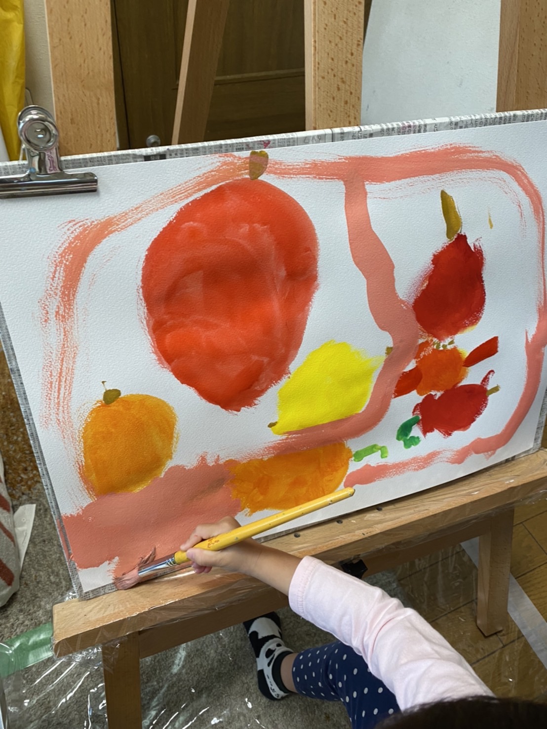 くだものそれぞれの形や色をよく見て描きました。3歳さんは、絵の具を混ぜてきれいなオレンジ色を作って描いています。また、背景の色は好きなピンク色とのことで、画用紙全体にしっかり塗っていいですね!