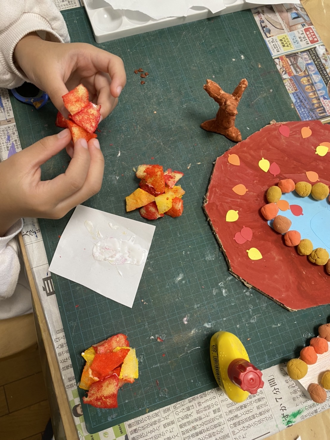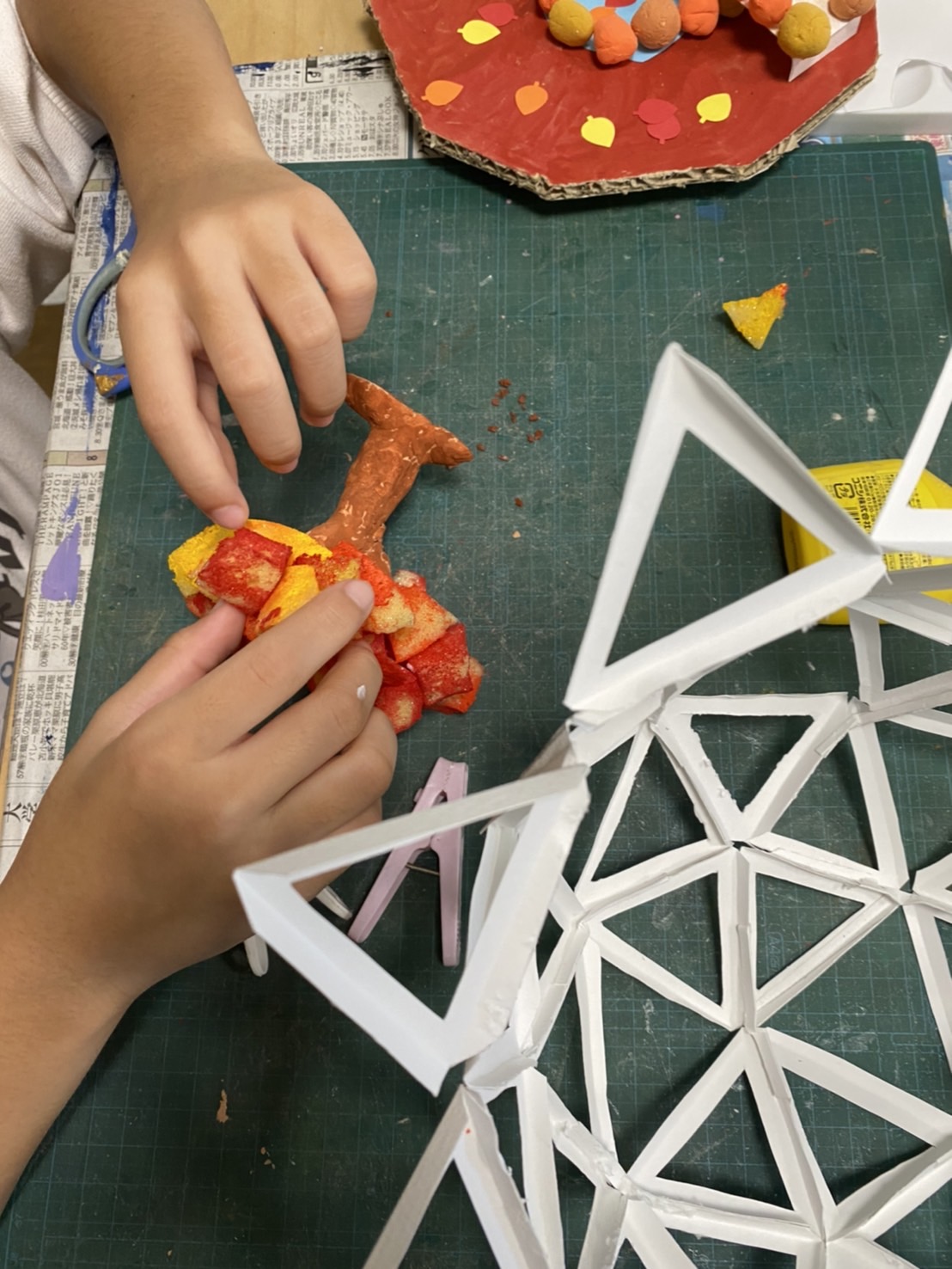 そして、ジオデシックドーム工作作りは、前回準備した紅葉の木の葉のパーツをボンドでくっつけて3つの大きな塊を作っていきました。