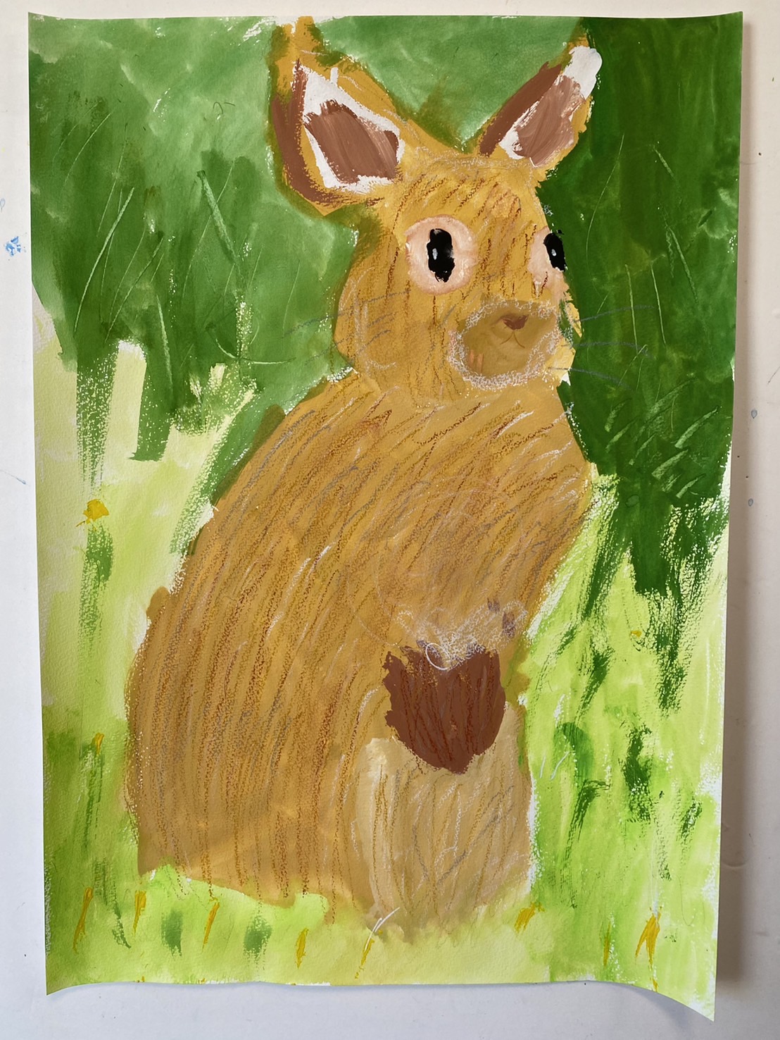 ウサギの作品は、薄い色から濃い色を重ねて、そして、毛の流れはクレパスで何色か重ねて描いて自然な毛並みの量感が出ていますね。