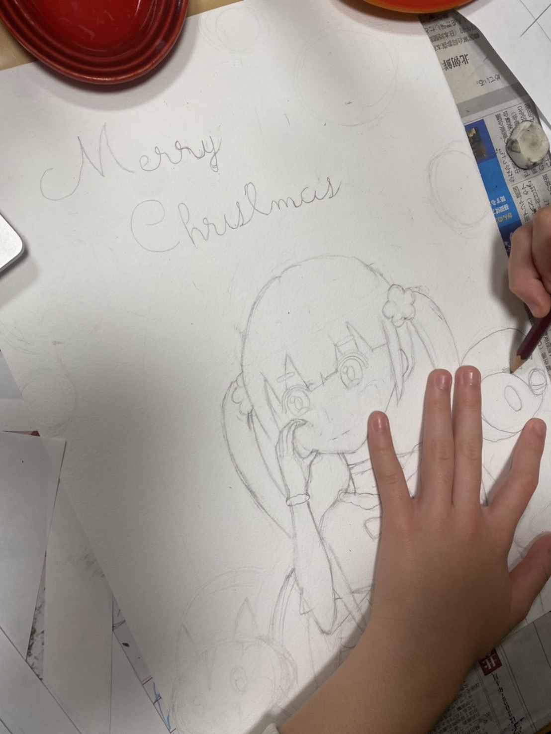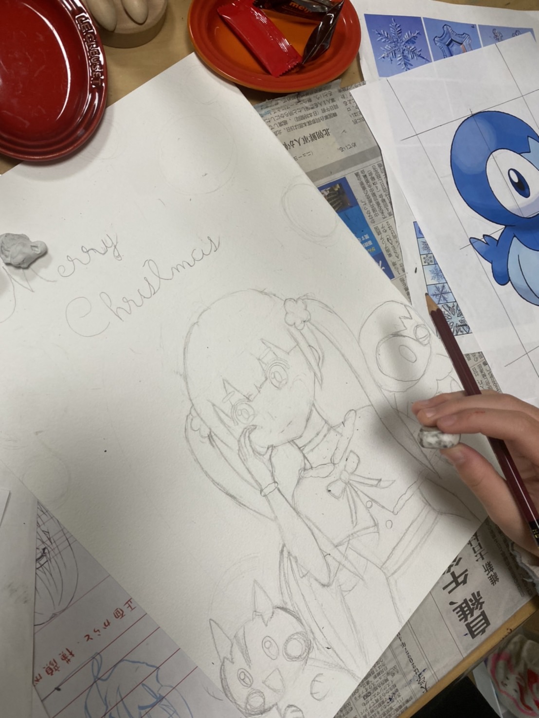 クリスマスの文字を筆記体で描いて線の動きも出ましたね!また人物の左右にポケモンキャラを配置して、楽しい構図が出来ました!