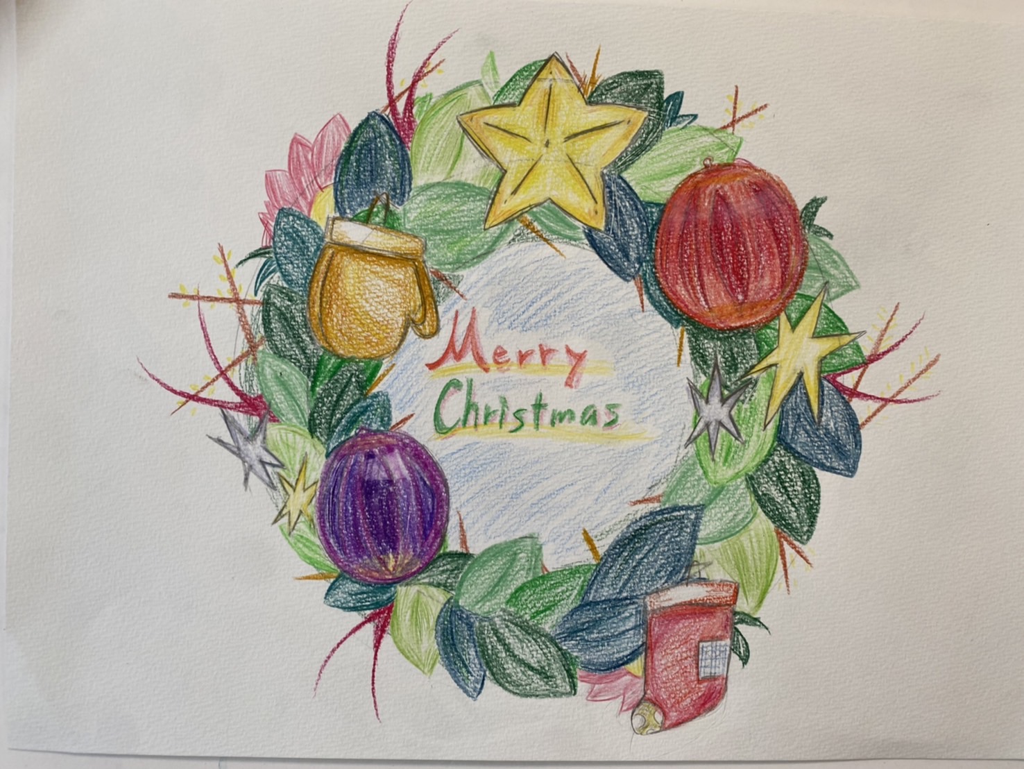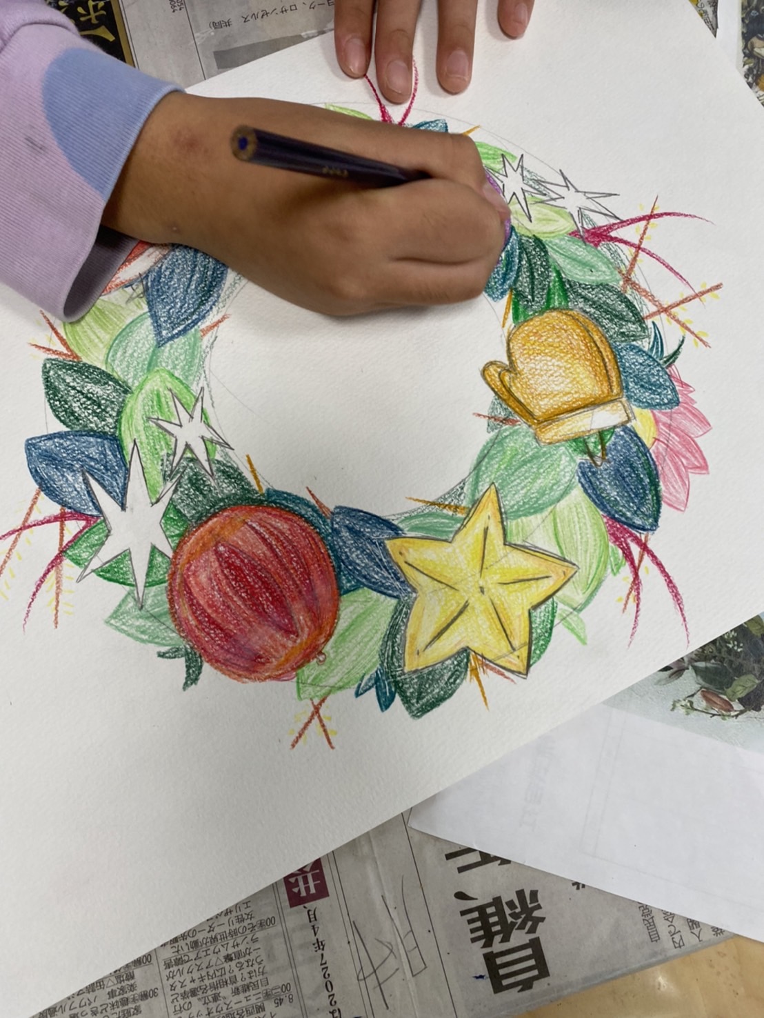 そして、こちらの生徒さん色鉛筆でクリスマスリースを描きました。