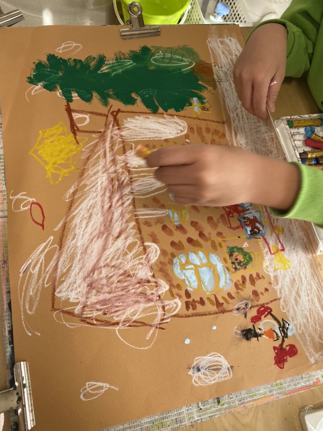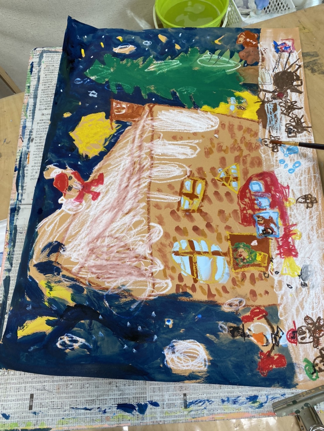 こんにちは、2025年12月13日 土曜日(午前)クラスでは、クリスマスの絵を描きました。