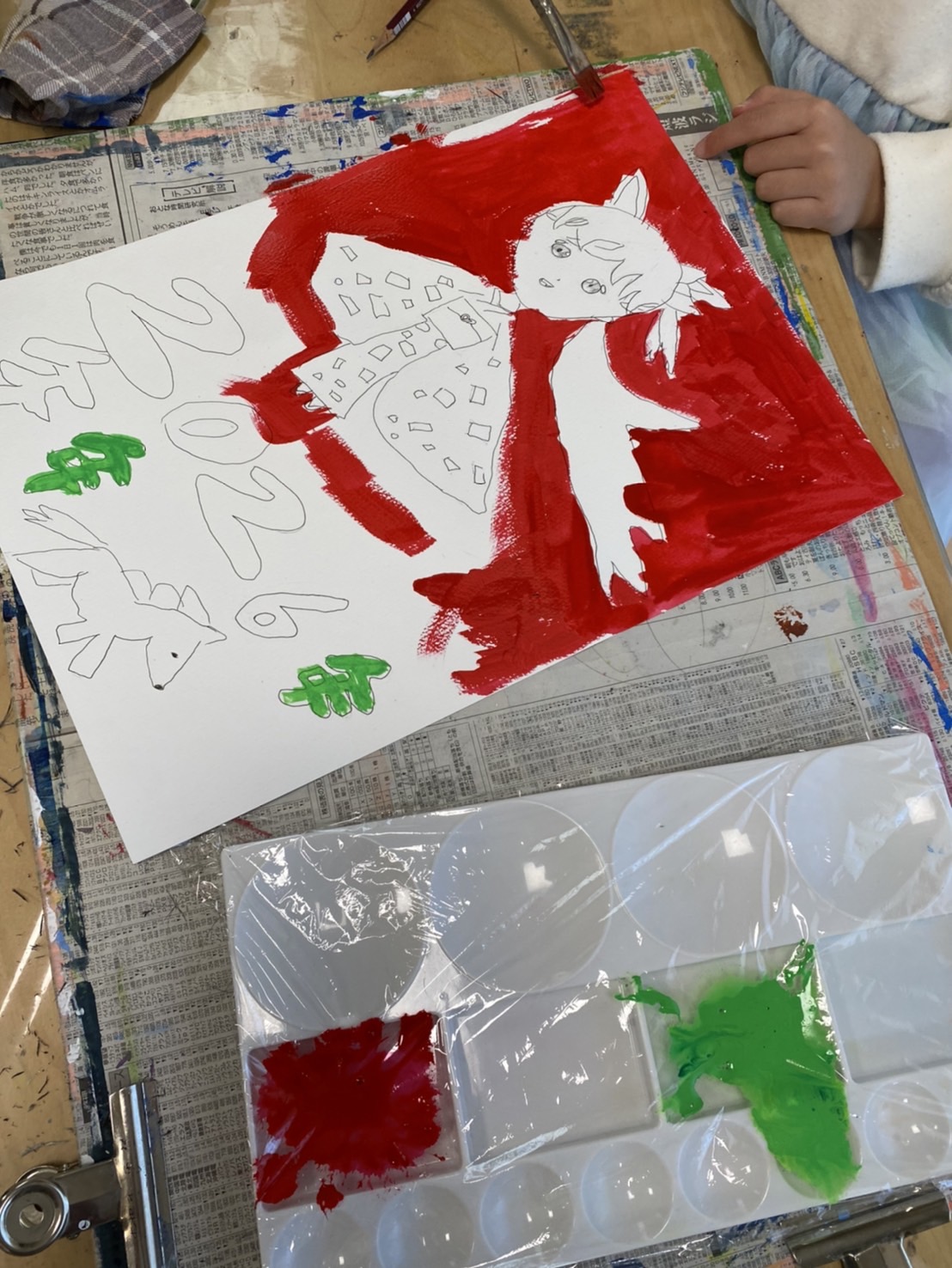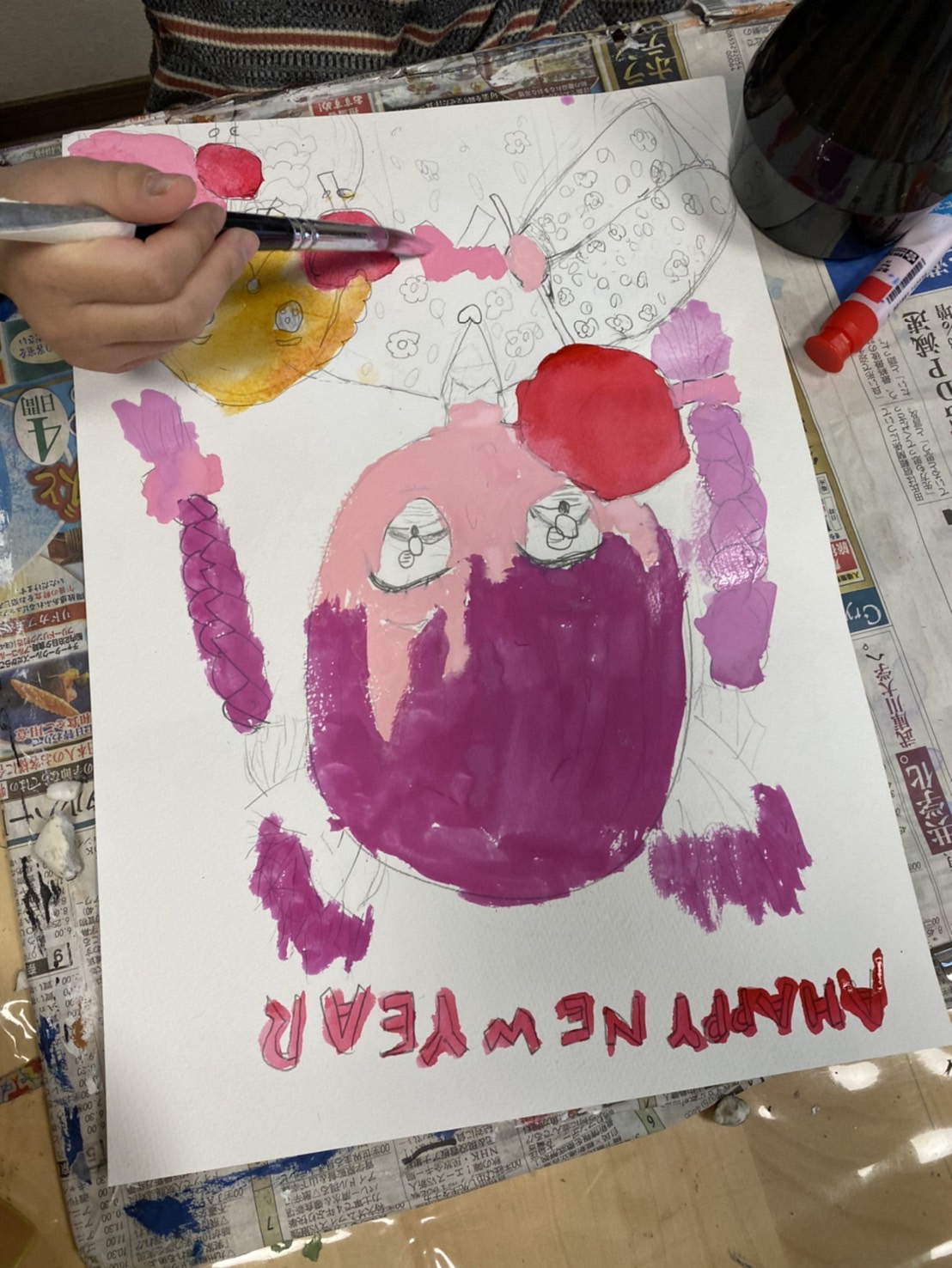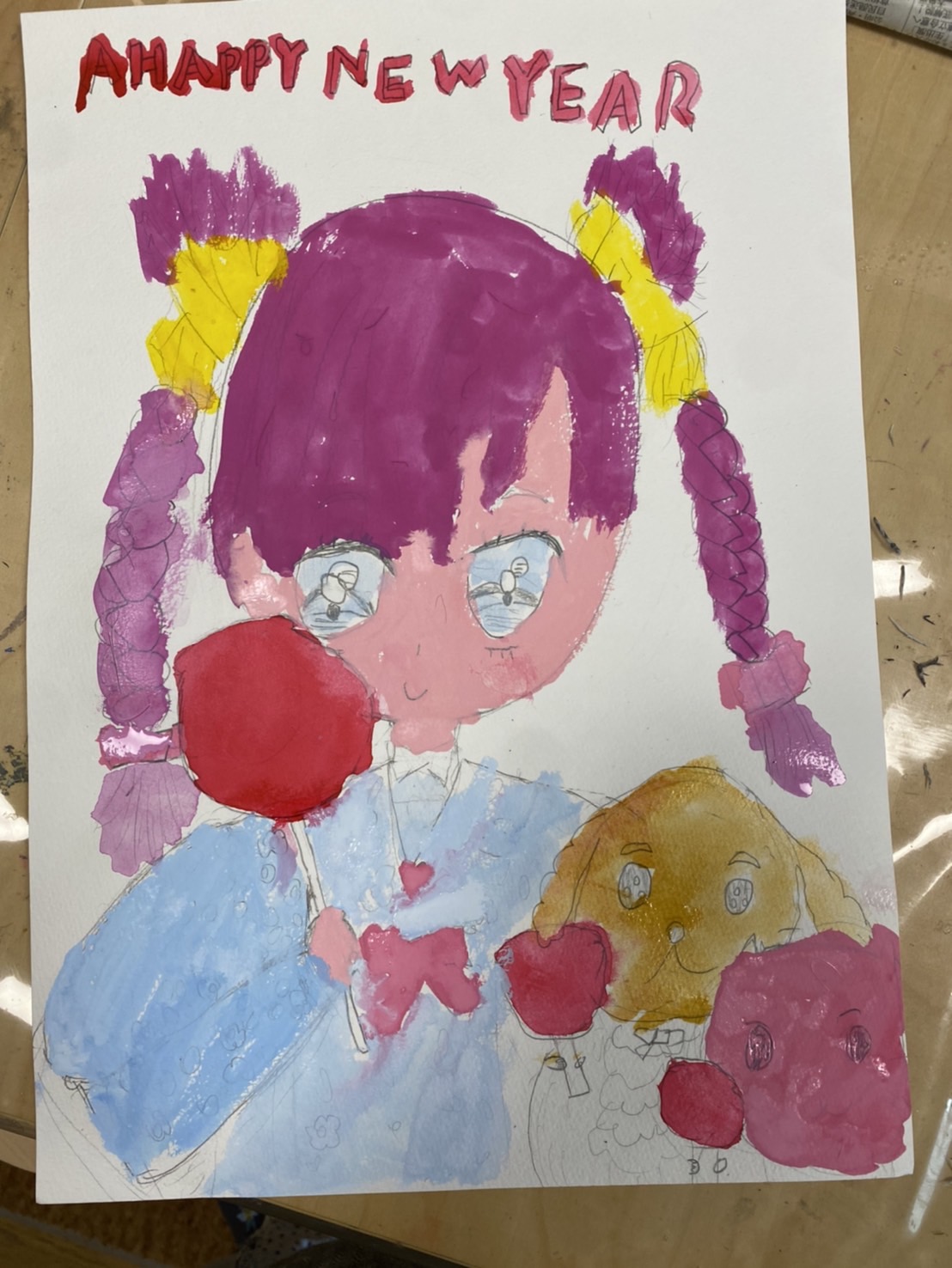こんにちは、2025年12月20日 土曜日(午後)クラスでは、カラフル絵画、りんご飴のイラスト、午年のイラストを描きました。