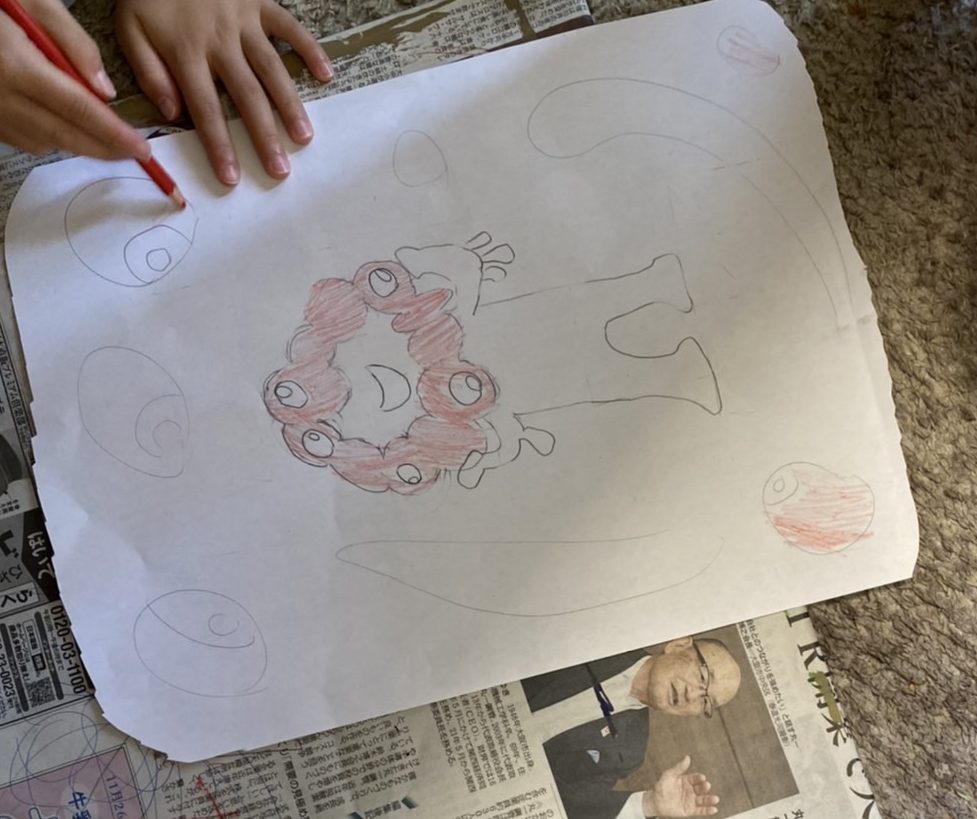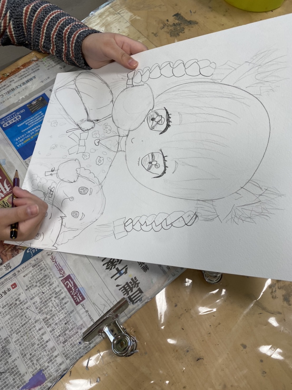 そして、りんご飴のイラストは、りんご飴のモチーフがテーマに女の子の絵を描いていきました。今回は顔を大きく描く構図で描いていきました。顔の大きさがいつもより数倍大きく描くことになりましたので、大きさにびっくりしたと思いますが、りんご飴とお顔と見てほしいところをしっかり描くことが出来ましたね!色の組み合わせもかわいい!