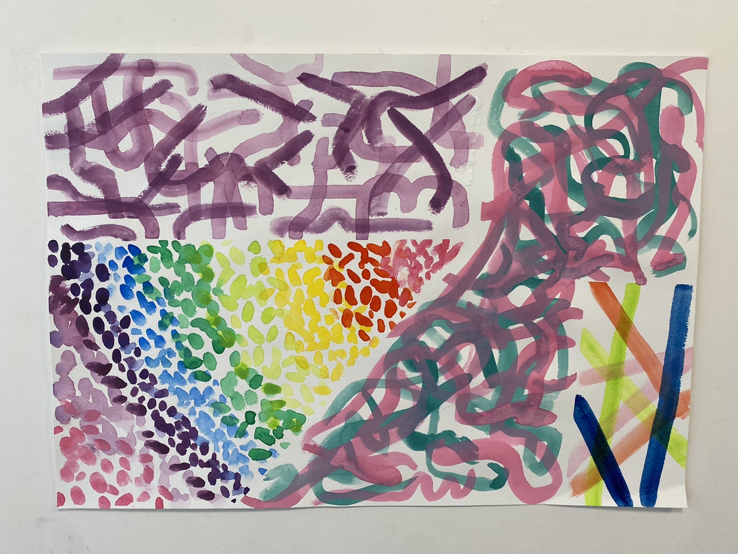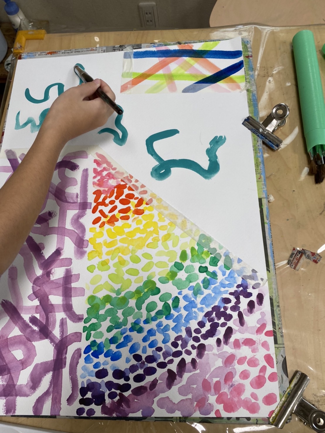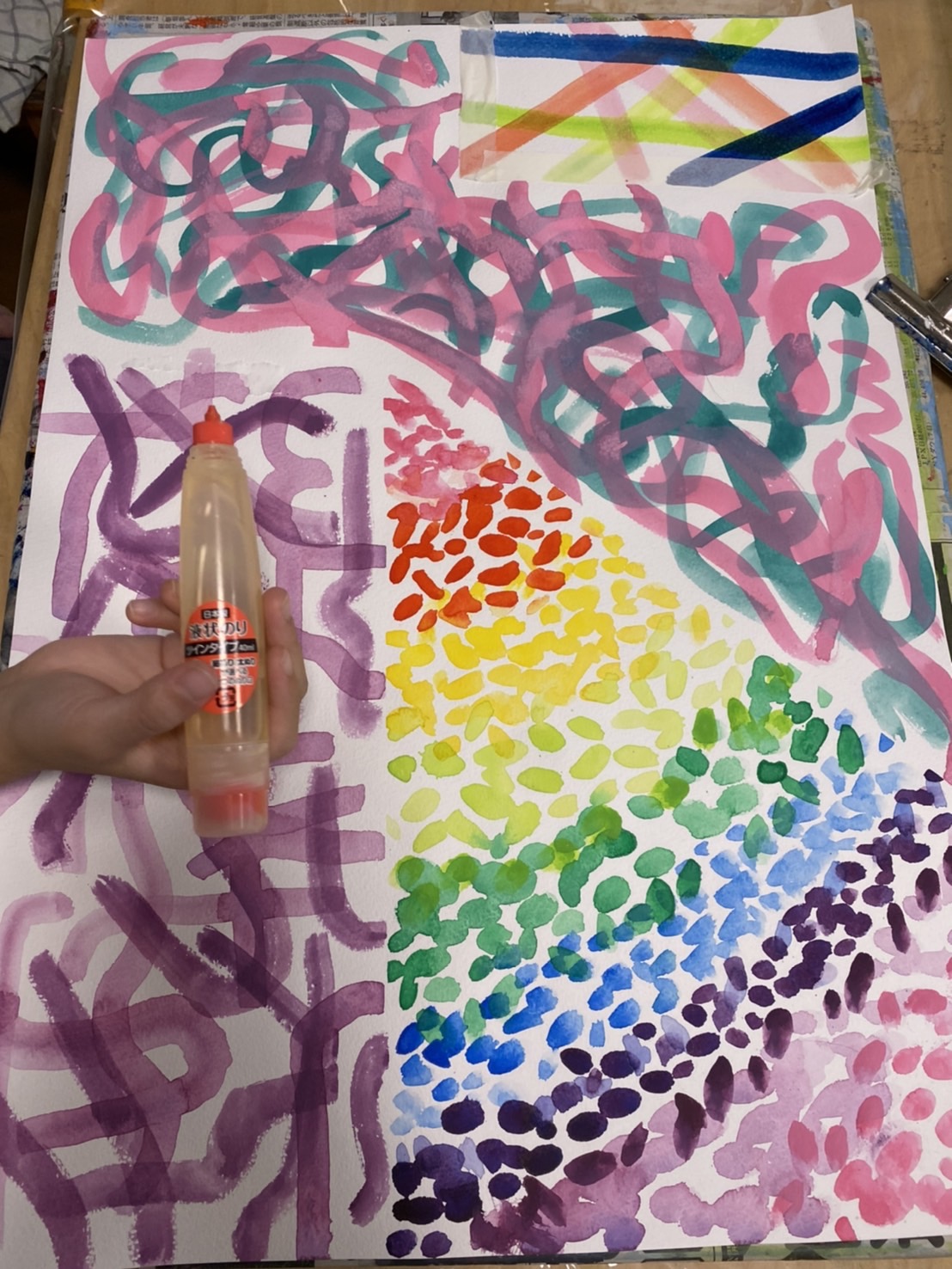今までは色を混ぜずに彩度高めの色で表現していましたが、今回は白を混ぜた色を組み合わせるとどんな感じか、挑戦していました。
