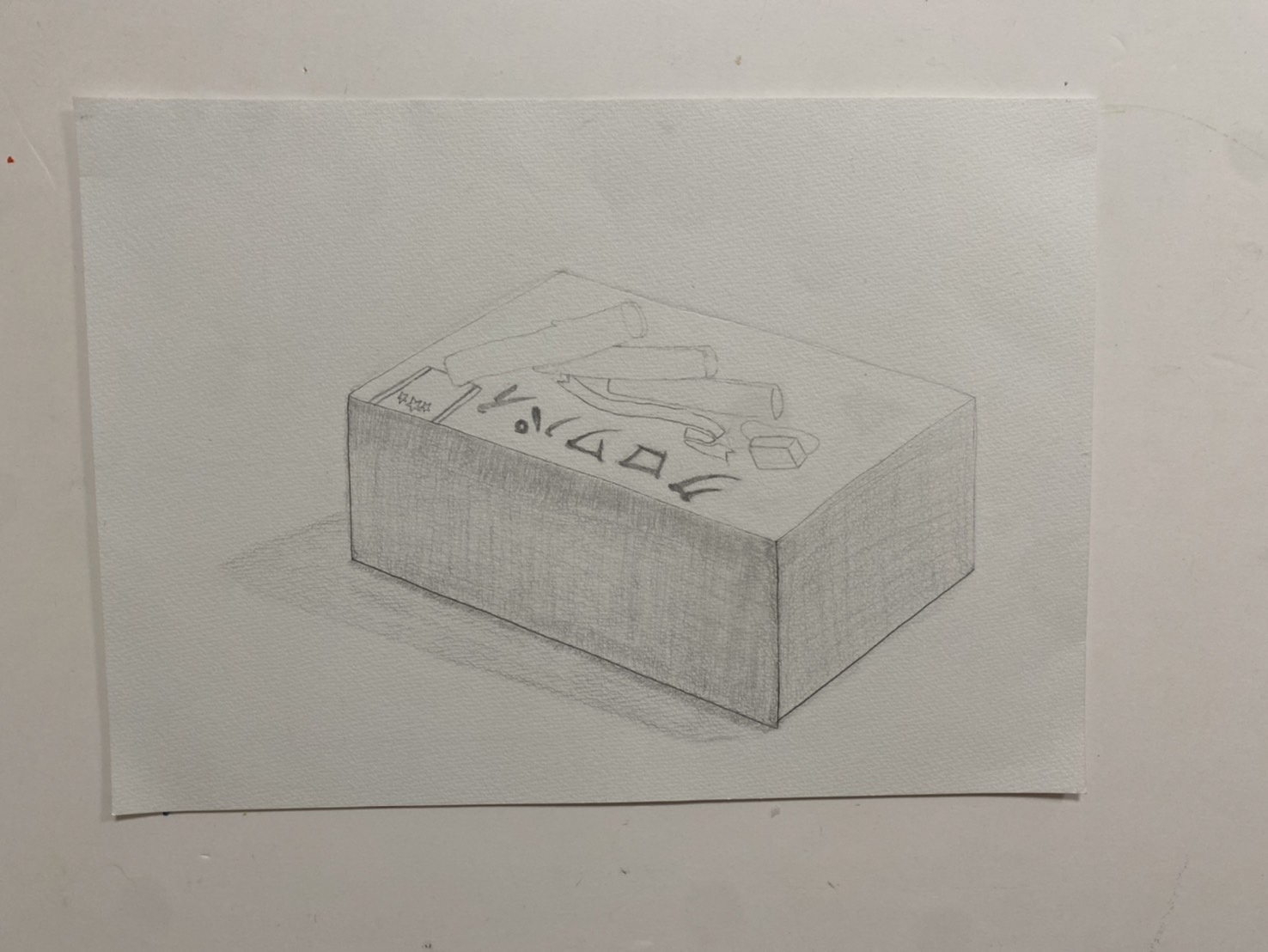 また、側面の鉛筆のタッチの密度を上げて、きれいな色になるように描いたり、箱のエッジを出したりしました。