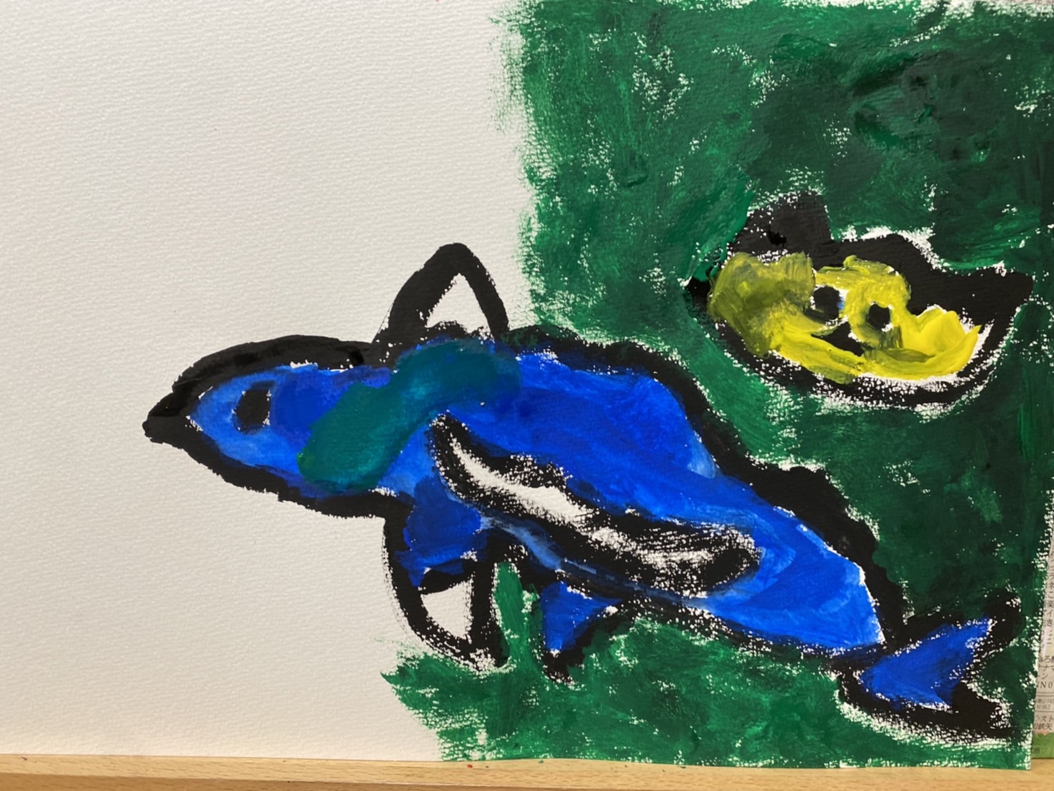 クレパスの特徴をいかして、発色よく、ふわふわした質感や、暖かい感じなどが出ましたね。また、色鉛筆で影の描き込みなどもし、メリハリも付けています。