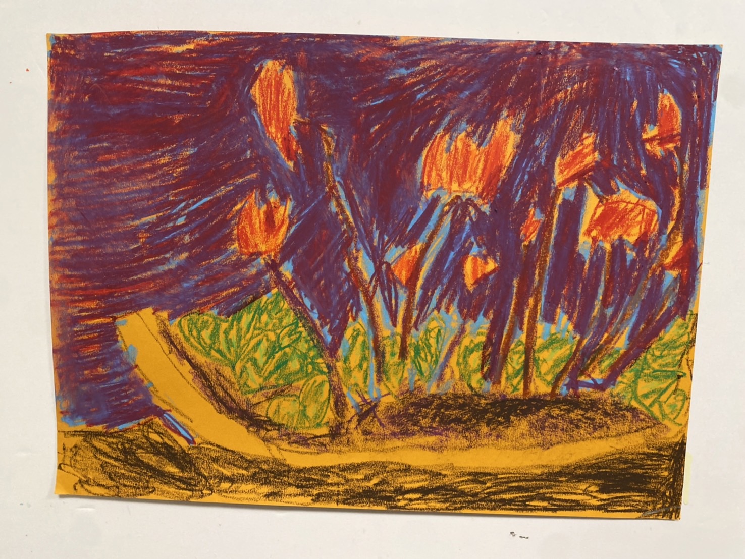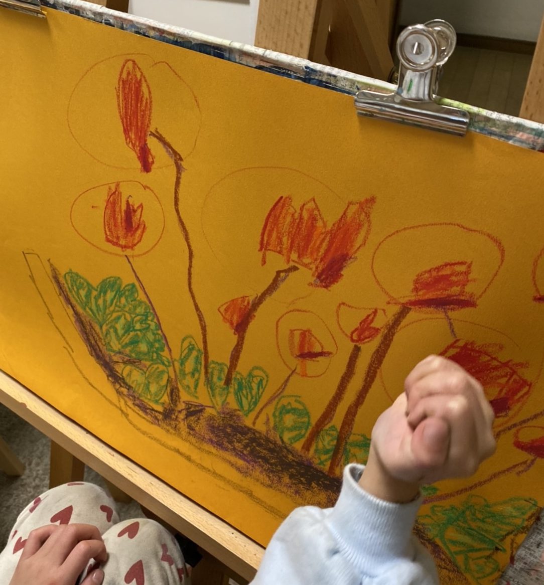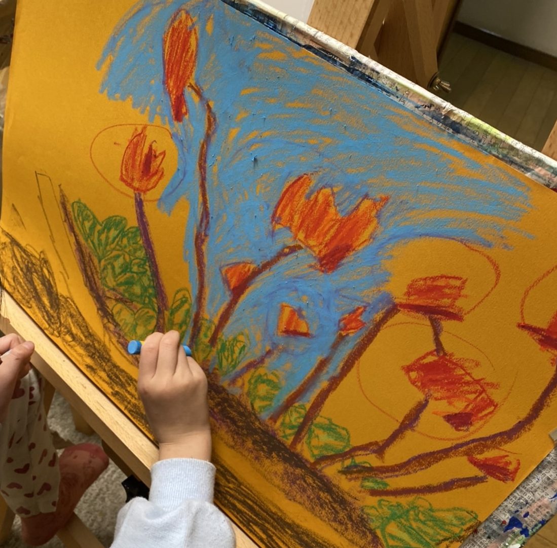 画用紙に大きくお花を配置して、元気よくクレパス重ねて描き、がんばりました。背景もしっかり塗ってお花の形を出しています。