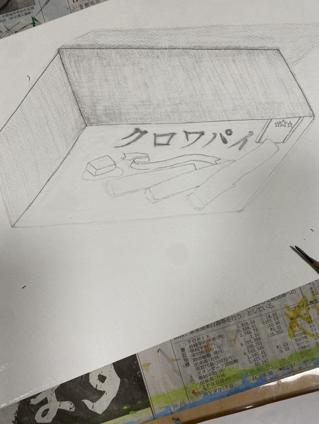 お菓子の箱のイメージですが、難しかったのは、バターの形とのことです。箱が上下反対に置いて描いているので、バターの直方体の形を把握するのが難しかったとのことです。確かに、これはよく見て描くしかないですね。