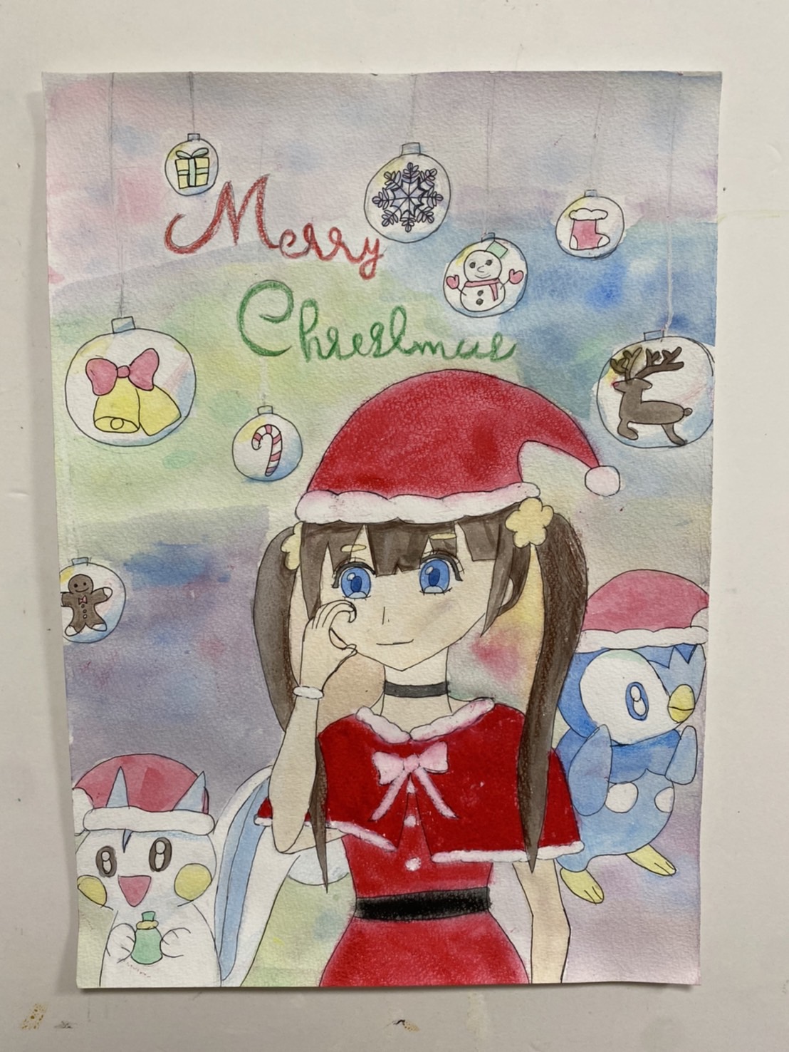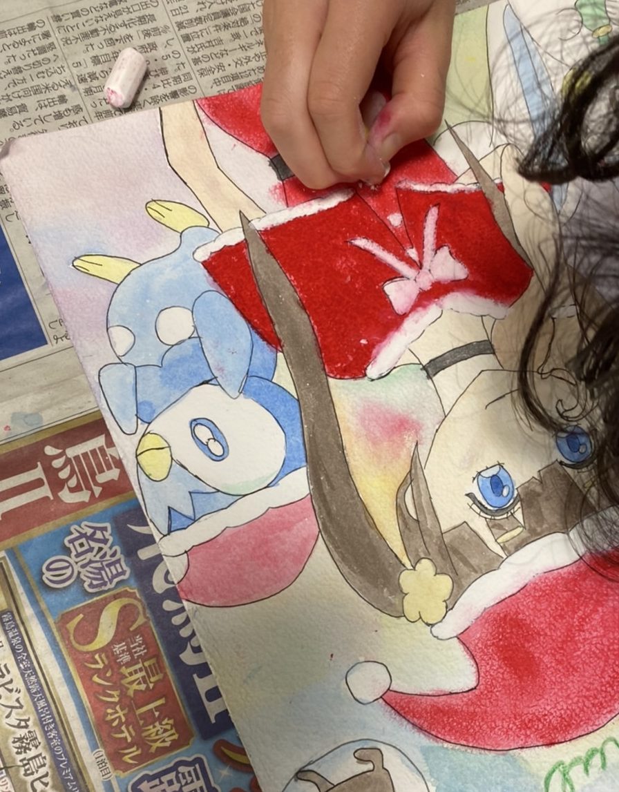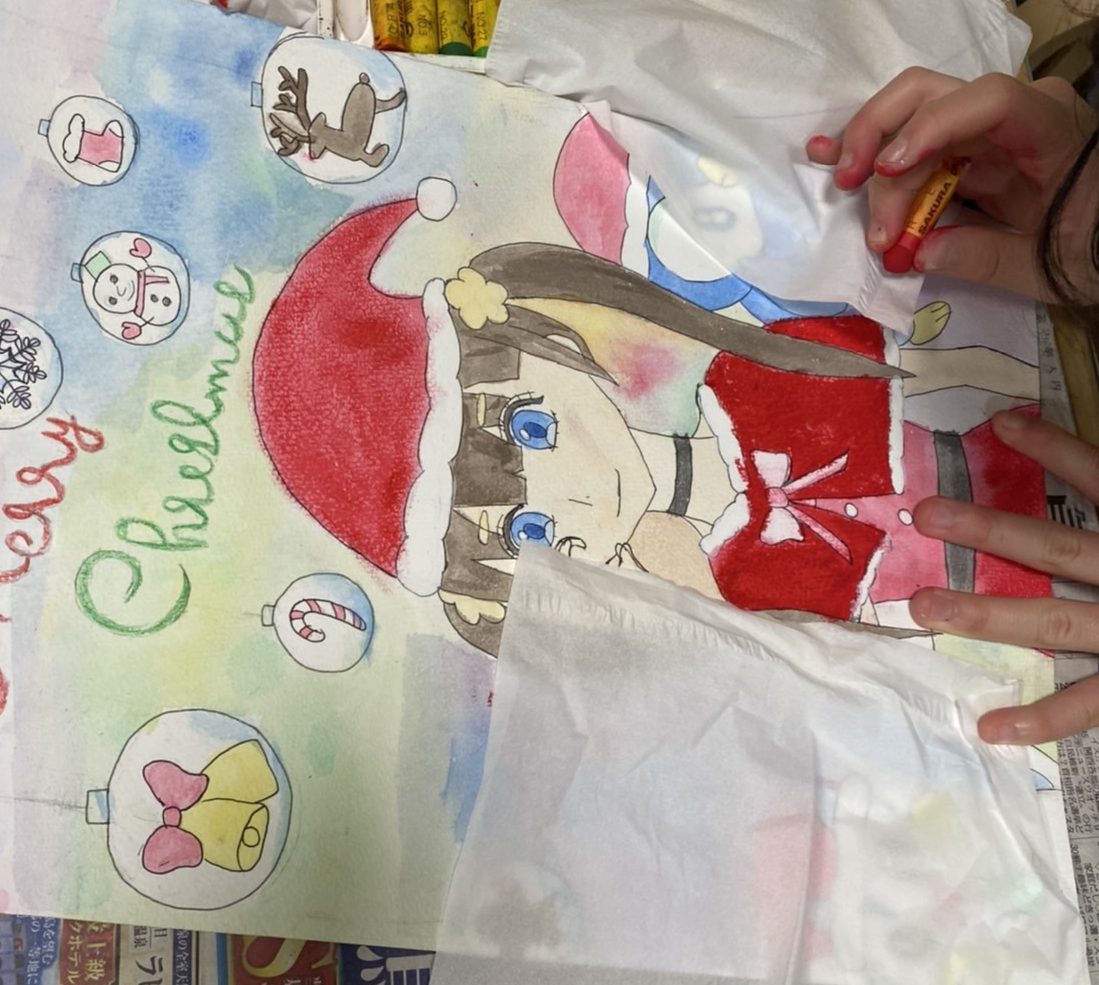 そして、クリスマスのイラストは、最後の仕上げに、クレパスで主役の人物のクリスマスの衣装を重ね描きしました。