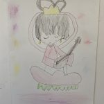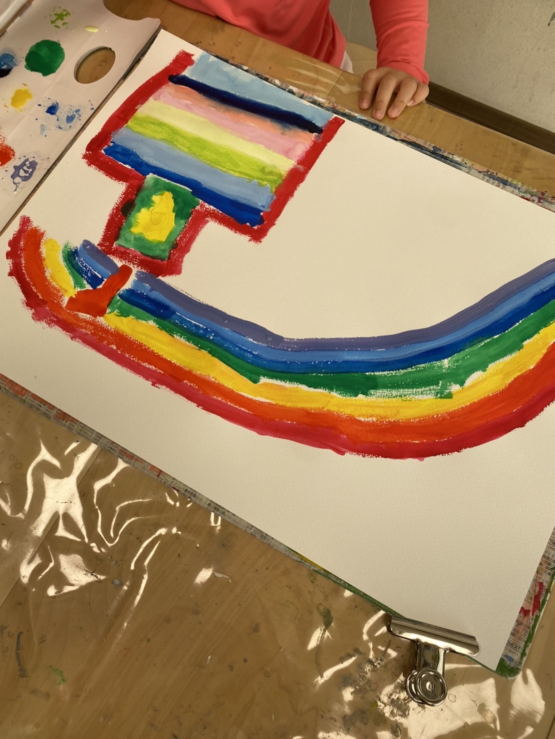 そして、自由絵画では、虹色のお城を描いて、アリエルを描いていました!筆に絵の具をつける工程をよく取り組んで、画用紙に絵の具をのびやかに描いていました。発色よく鮮やかです!
