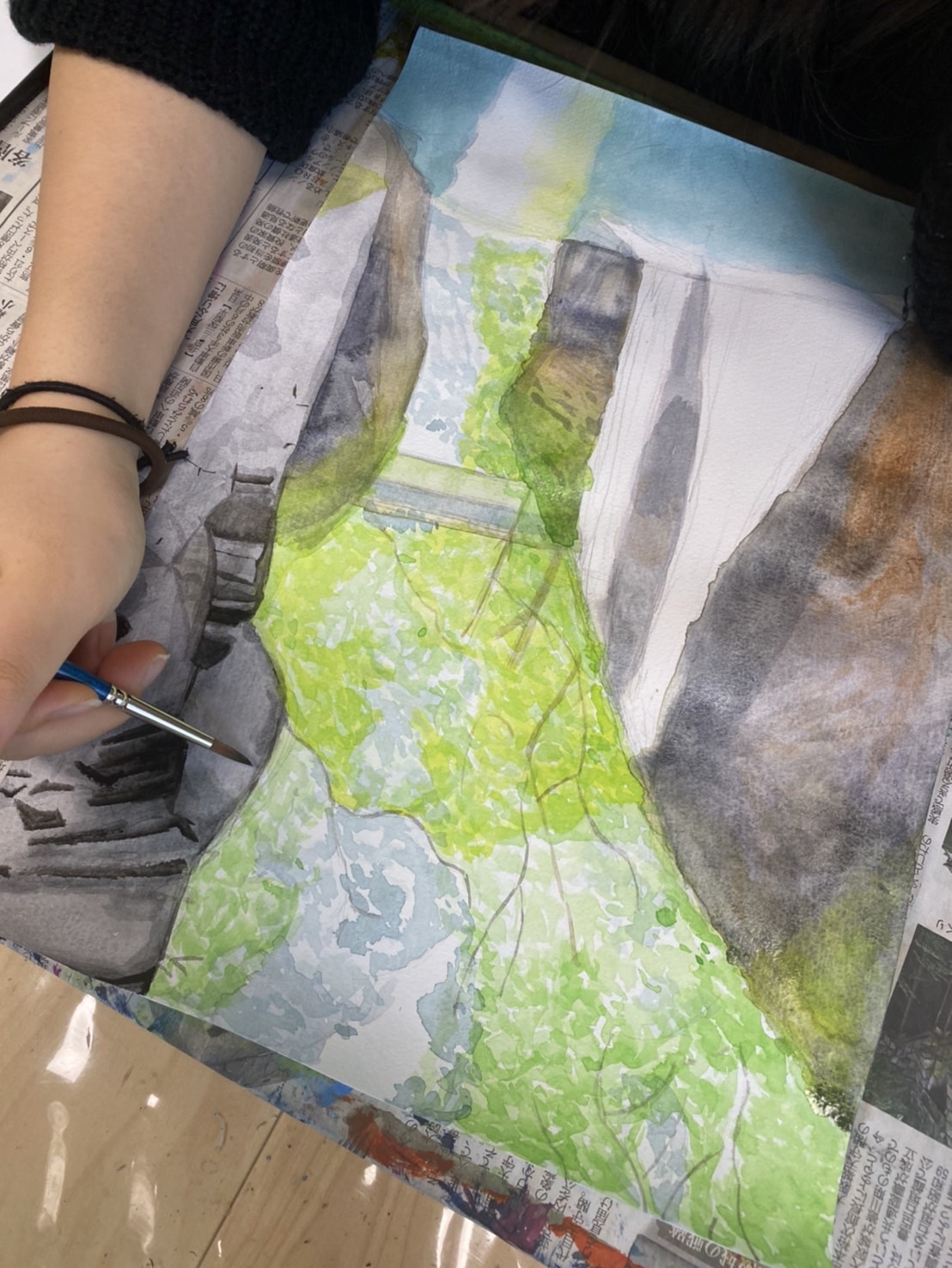 こんにちは、2026年1月18日 日曜日(午後)クラスでは、高千穂峡の風景画を描いています。