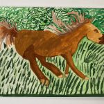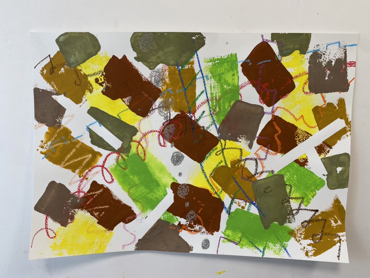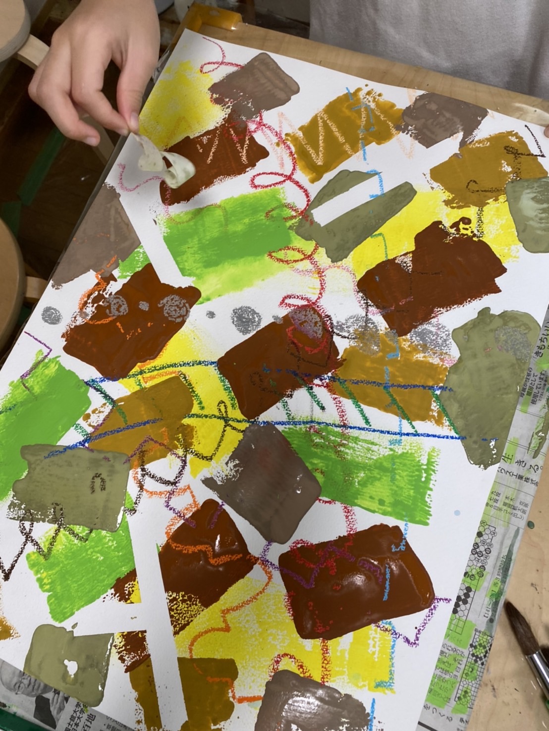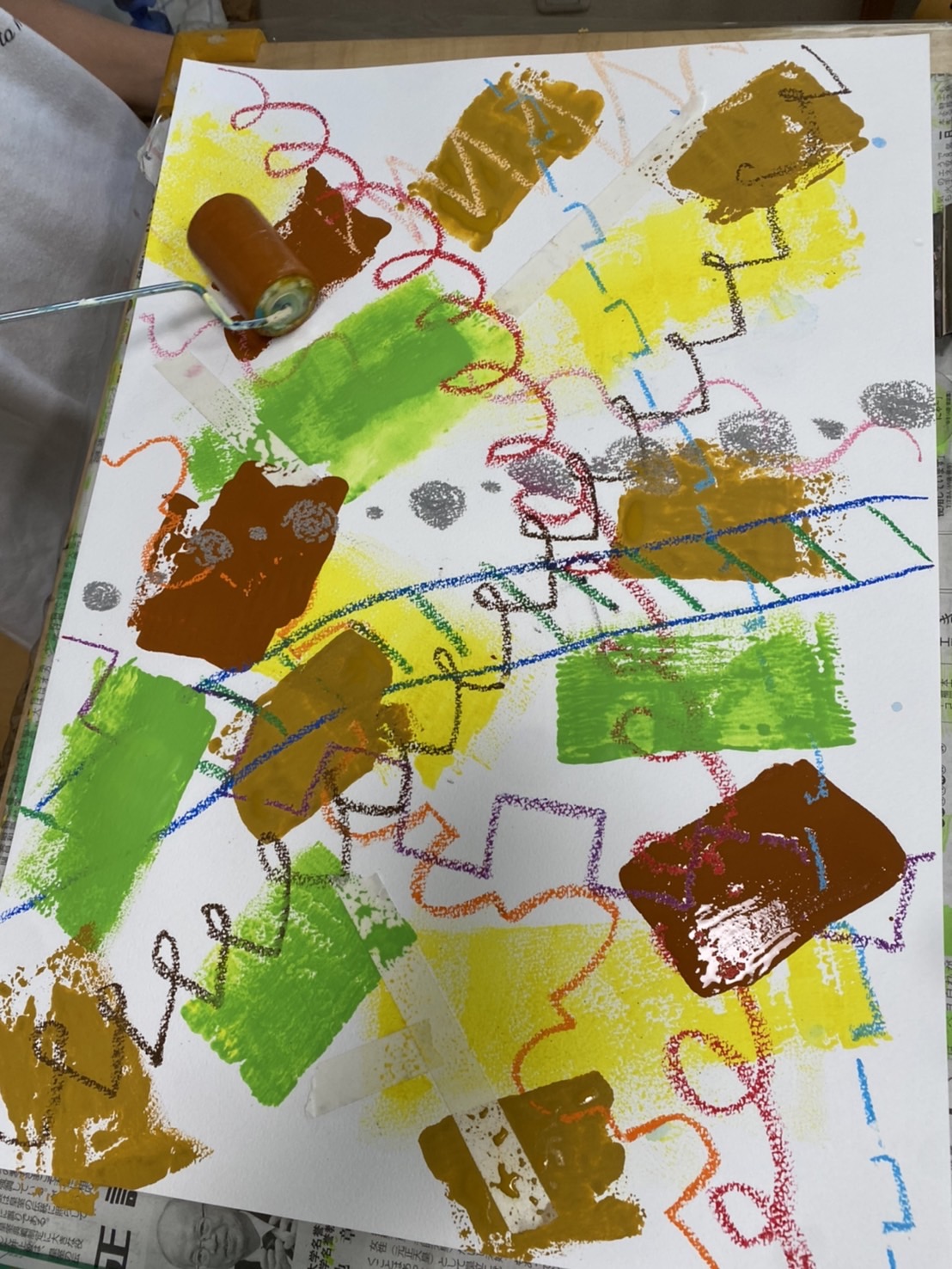 色はローラーでいろんな色をのせて、弾む色の濃淡が線と響きあっていますね!