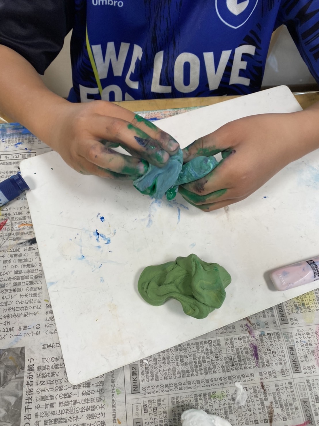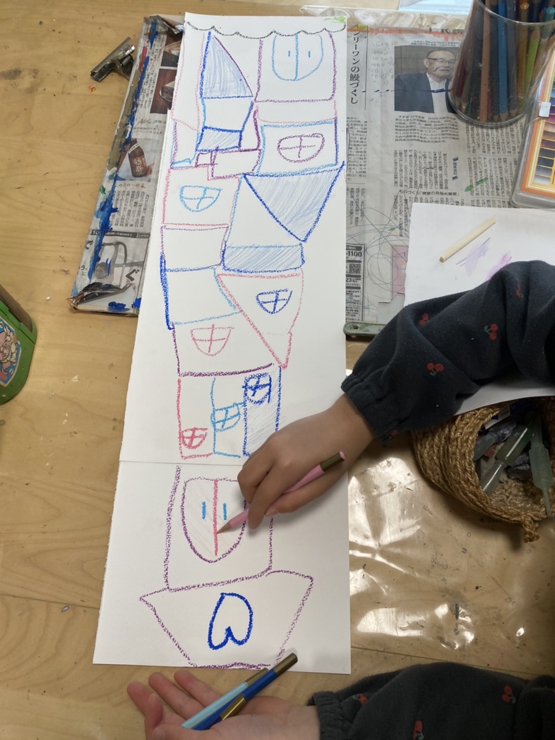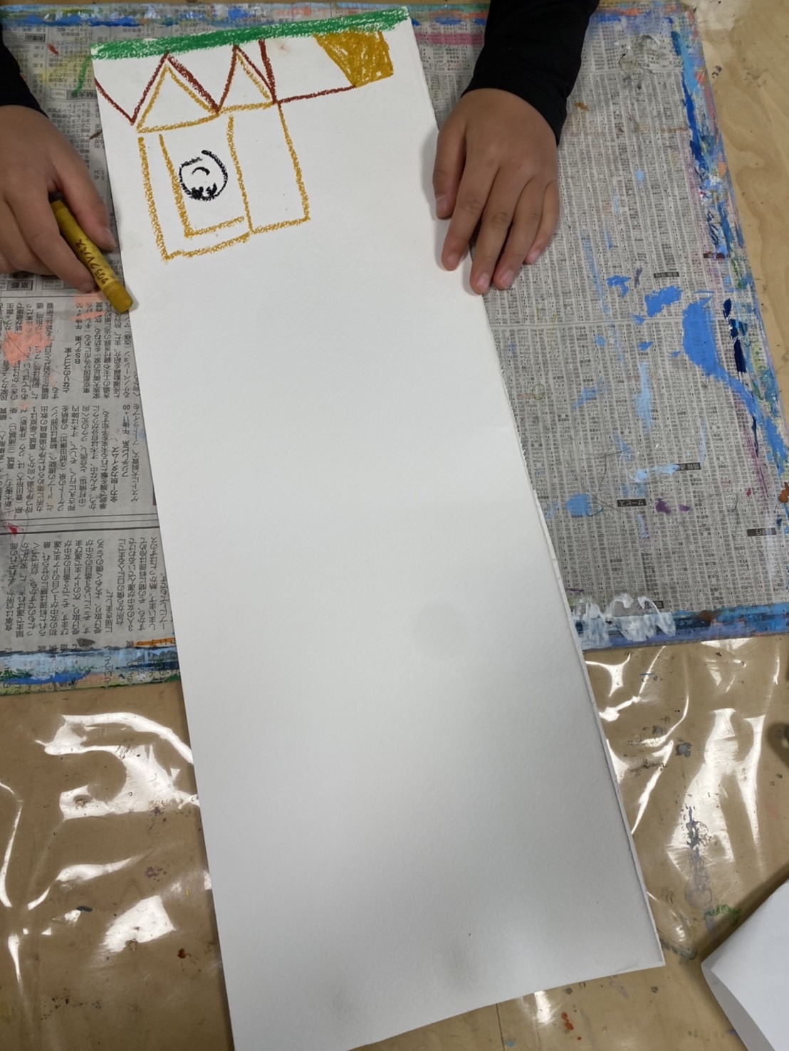 こんにちは、2026年1月31日 土曜日(午後)クラスでは、はじき絵と、つみきタワーを描きました。
