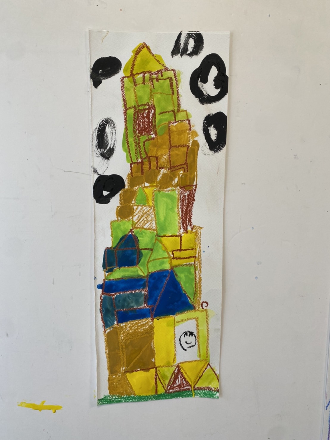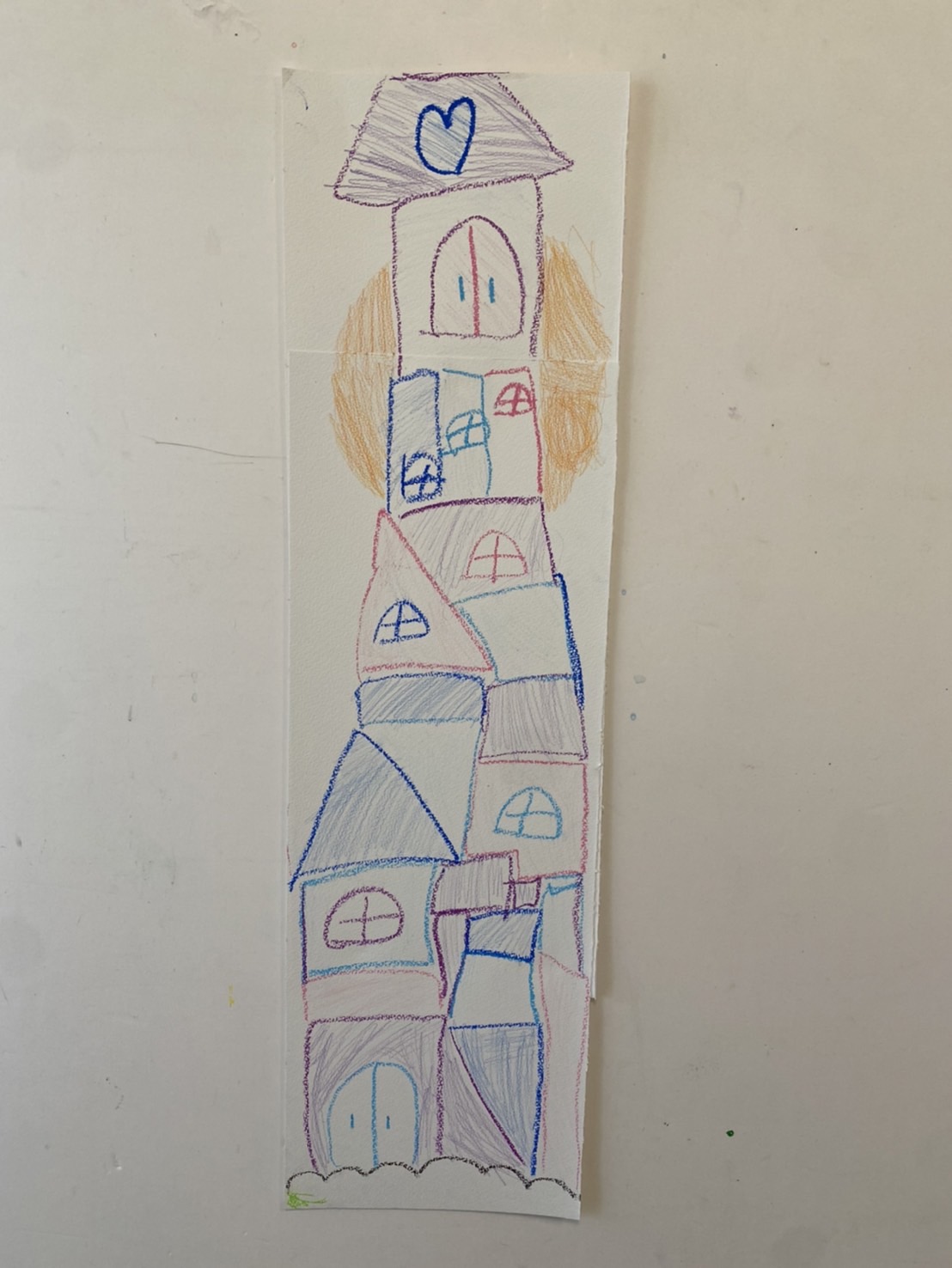 そして、こちらのつみきタワーは、クレパスで線をしっかり引いてがっしりした作りです。