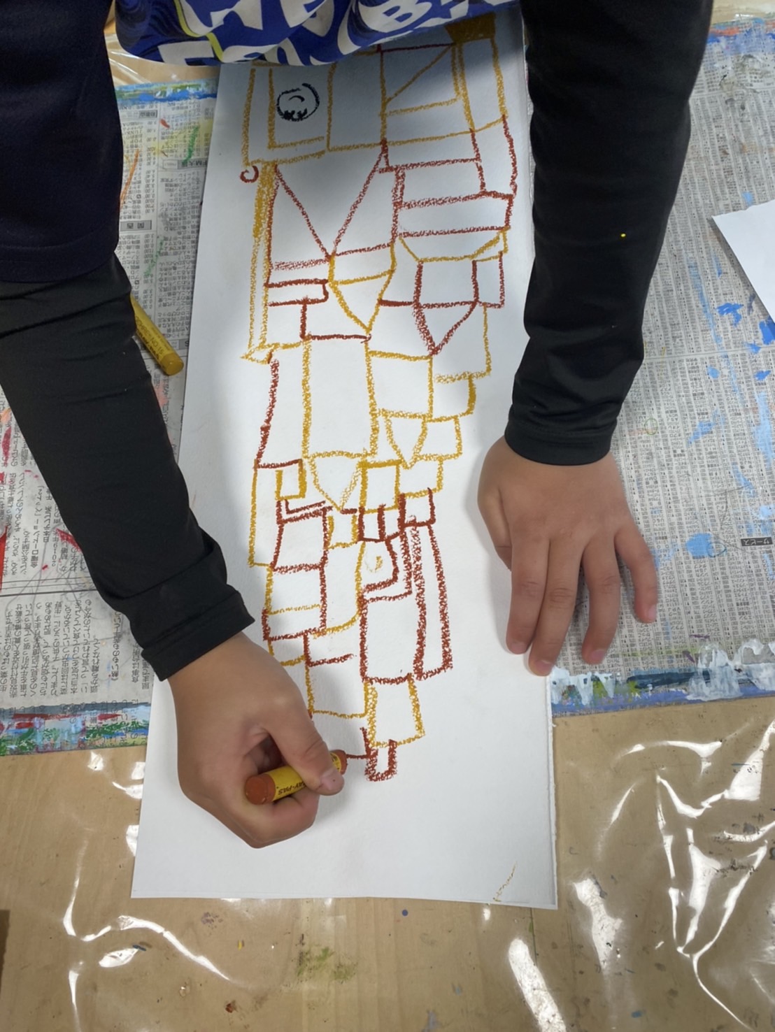 色は絵の具を使って、クレパスの線とのバランスもよく見て、色をまとめつつバランスを見て描いていますね!